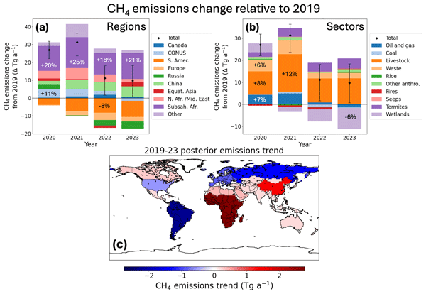 We use satellite observations of atmospheric methane, a greenhouse gas, to calculate emissions from both human and natural sources. We find that methane emissions surged in 2020–2021 before declining in 2022–2023. We attribute the surge in large part to emissions from eastern Africa, which experienced large methane-generating floods. Wetland models underestimate emissions in that region, which has led some previous work to incorrectly attribute the African surge in methane emissions to livestock.