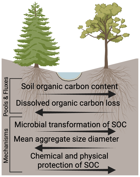 Our study looked at how different forest types and conditions affected soil microbes and soil carbon and stability. Aspen organic matter led to higher microbial activity, smaller soil aggregates, and more stable soil carbon, possibly reducing dissolved organic carbon movement from hillslopes to streams. This shows the importance of models like the Microbial Efficiency – Matrix Stabilization framework for predicting CO2 release, soil carbon stability, and carbon movement.