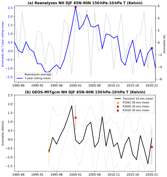 This study used reanalysis datasets and a 1-degree coupled General Circulation Model to analyze the Northern Hemisphere stratospheric temperature response in a decadal simulation. Results show that the polar stratospheric temperature increased from 1992 to 2000, contrary to the expectation of stratospheric cooling due to rising CO2. The study concluded that changes in ozone and CO2 drive the meridional eddy heat transport, dictating polar stratospheric temperature behavior.