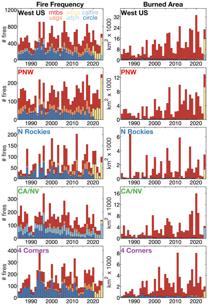 The Western United States MTBS-Interagency Database of Large Wildfires, 1984–2024 (WUMI2024a) represents more than 22000 large (≥1 km2) wildfires in the western United States from 1984 through 2024, including maps of fire perimeters and areas burned. It was compiled from seven government datasets and quality controlled. This dataset will aid research on the causes and effects of wildfire in a changing world.