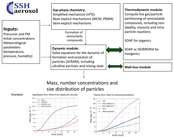 The model simulates the evolution of primary and secondary pollutants via gas-phase chemistry, aerosol dynamics (including ultrafine particles), and intra-particle reactions. It uses a sectional approach for size and composition, includes a wall-loss module, and links gas-phase mechanisms of different complexity to secondary organic aerosol formation. Representation of particle phase composition allows viscosity and non-ideality to be taken into account.