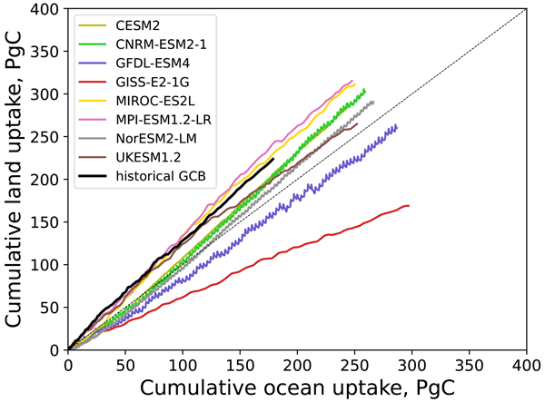 Idealized experiments with Earth system models provide a basis for understanding the response of the carbon cycle to emissions. We show that most models exhibit a quasi-linear relationship between cumulative carbon uptake on land and in the ocean and hypothesize that this relationship does not depend on emission pathways. We reduce the coupled system to only one differential equation, which represents a powerful simplification of the Earth system dynamics as a function of fossil fuel emissions.