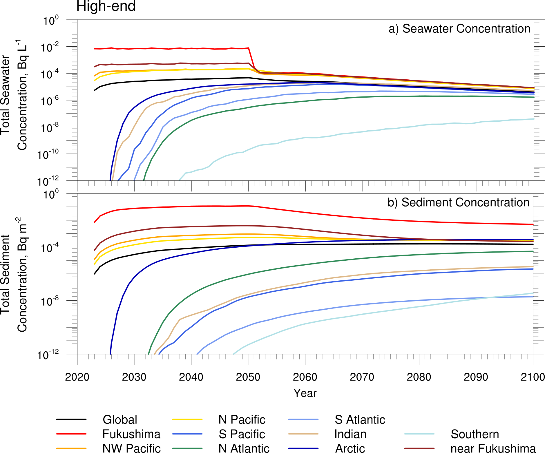 The primary seven radionuclides account for 15 % of the modeled global total concentrations in the first year of release for the high-end release scenario (Fig. S3), with tritium contributing more than 80 % (Fig. 2). However, we find that this fraction of the seven radionuclides increases exponentially with time, especially after 2050. In 2100, the fraction is further projected to increase to 52 %, with a slightly higher fraction in basins farther away from the North Pacific Ocean basin. This is because many of these radionuclides have a much longer decay half-life (τ) (e.g., 28.1 years for 90Sr and 16 million years for 129I) than 3H (12 years). This highlights the importance of radionuclides other than 3H in the long term. The transport patterns for the low-end and intermediate-release scenarios are similar but with lower concentration levels, reflecting their lower releases. Given the natural background concentration of tritium (∼ 50 Bq L−1) and the authorized current discharge rates, the simulated signals remain below detectable levels, and no observable anomaly has been identified to date. The modeled concentrations should thus be interpreted as indicative of potential transport pathways rather than as detectable signals.
