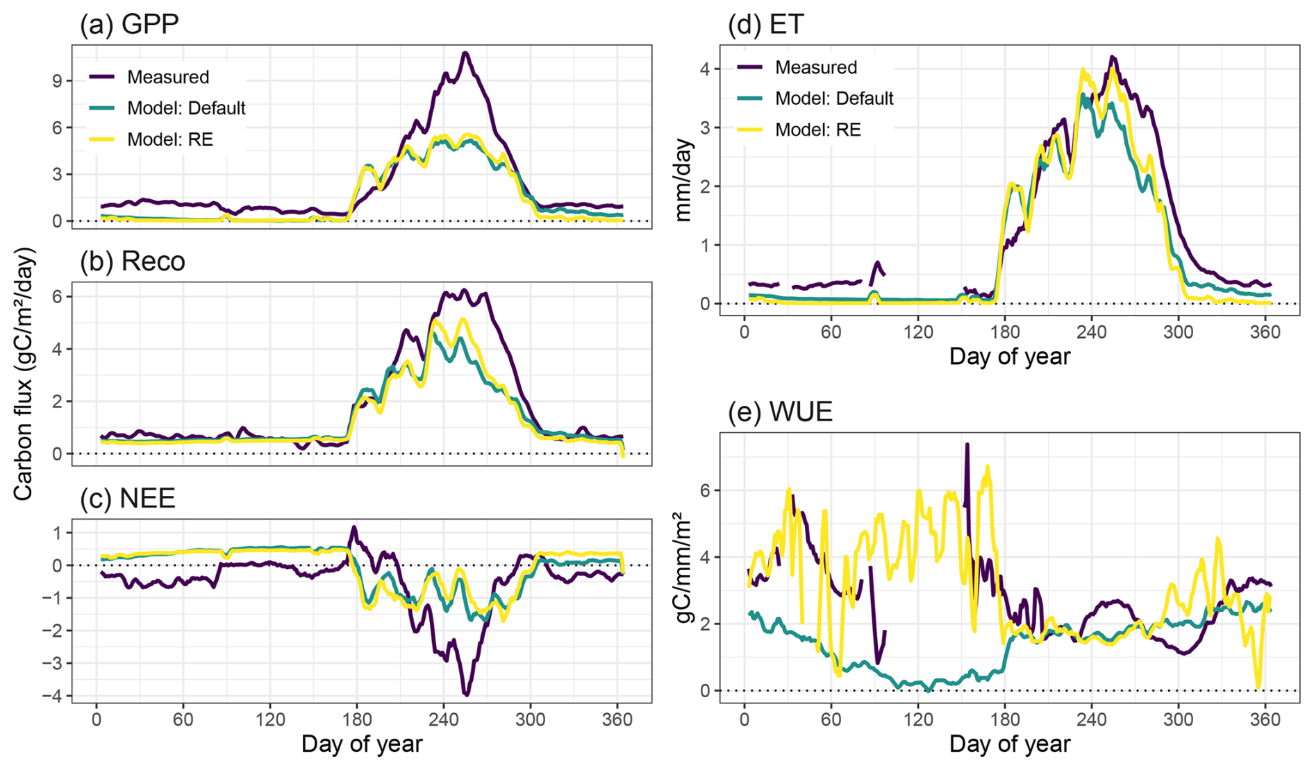 Evaluating both model versions (with free drainage) against in situ measurements of carbon and water fluxes showed only small differences in model performance, for both the full-year and wet-season metrics (Fig. 4, Table 1). Simulated GPP by both model versions underestimated the eddy-covariance-derived GPP overall. The start of the growing season around day 180 was much more abrupt in both models, compared to the smoother transition in the measurements. This is because all raingreen plants become active with full leaf cover at the same time in the model, while in reality there will be some variability in leaf flushing between individuals, as well as a more gradual leaf growth. Dry-season GPP fluxes were underestimated by both models and close to zero overall, although the default model version had a larger tail in GPP after the end of the rainy season (Fig. 4a). Ecosystem respiration fluxes (Reco) during the rainy season were slightly better represented in the updated model version, having lower RMSE and higher correlation with observations than the default version, while dry-season respiration was relatively well captured by both models (Fig. 4b, Table 1). As the sum of these components, the total net ecosystem exchange (NEE) was poorly represented by both models, underestimating the observed net productivity in the rainy season and simulating a small source of CO2 during the dry season, in contrast to the observed sink (Fig. 4c). In contrast to carbon fluxes, water fluxes (E) were fairly well represented by both models (Fig. 4d, Table 1). The new RE-based model showed a better agreement with the peak evaporation during the wet season, while slightly overestimating the early wet season and underestimating its tail. Similar to its GPP performance, the default model version better captured the fluxes at the start of the dry season (Fig. 4d). Water use efficiency was underestimated by both models during the core growing season, mostly due to the underestimation of GPP. However, simulated WUE values were close to the measurements during the first month of the growing season. On the other hand, the low ET values in the late growing season and the dry season led to a significant overestimation of WUE in those periods (Fig. 4e). For both models, simulated WUE was the closest to observation-derived WUE during the wet season, where the default model had a lower RMSE, but the RE-based model had a slightly higher correlation (Table 1). For reference, full time series are shown in the Supplement (Fig. S7).