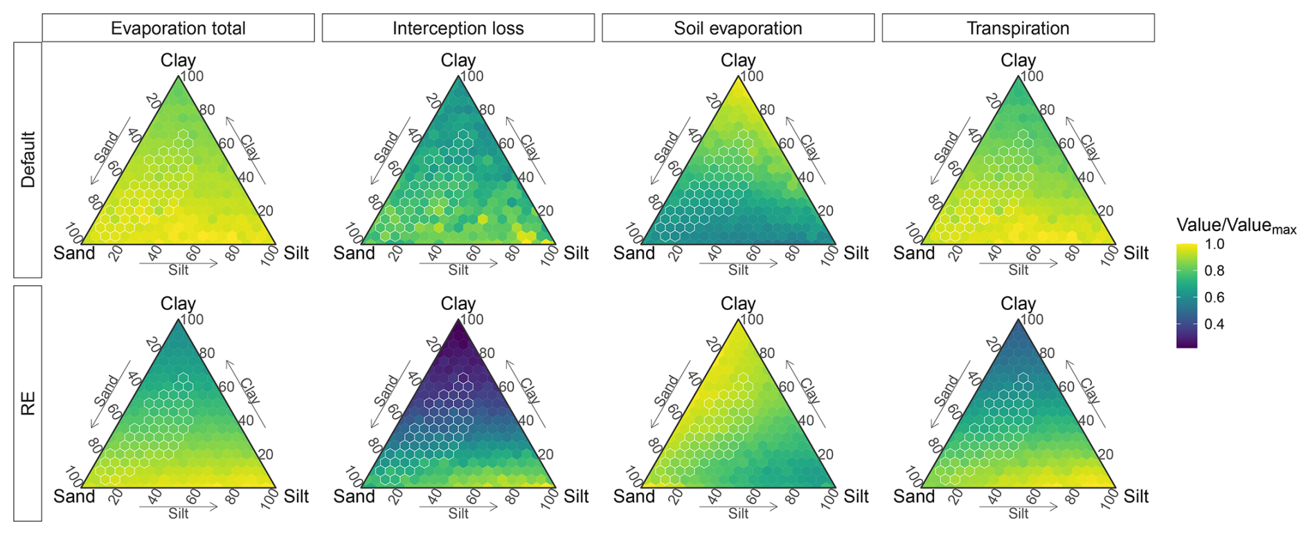 Soil hydraulic properties in the LPJ-GUESS v4.1 model are derived from soil texture using pedotransfer functions (Cosby et al., 1984; Smith et al., 2014). These include soil water content at wilting point (θWP), field capacity (θFC), saturation (θSAT), hydraulic conductivity at saturation (KS), and the slope (b) of the soil water retention curve (Sect. S1). We tested the model sensitivity to soil texture for both soil hydrology representations. To do so, we made a series of simulations for the Dahra flux tower site in Senegal, where we replaced the actual soil texture by all possible combinations of sand–clay–silt contents and analysed the simulated ecosystem response. Note that resulting soil hydraulic properties are the same between both model versions: the only difference is due to the different soil hydrology processes. For the RE-based model we used the “free drainage” bottom boundary condition, which matches the bottom boundary condition of the default model version the most closely. For the response variables we analysed vegetation leaf cover (LAI) and the different evaporation components. We compared the sensitivity of the default model version with our RE-based update by calculating the mean, standard deviation, and coefficient of variation of the model outputs over all soil textures, based on the averaged values over all years. Results were visualized using ternary plots, including a scaling by the maximum (over all soil textures) value of model output, in order to facilitate comparison of the sensitivities of the different analysed output variables to soil texture.