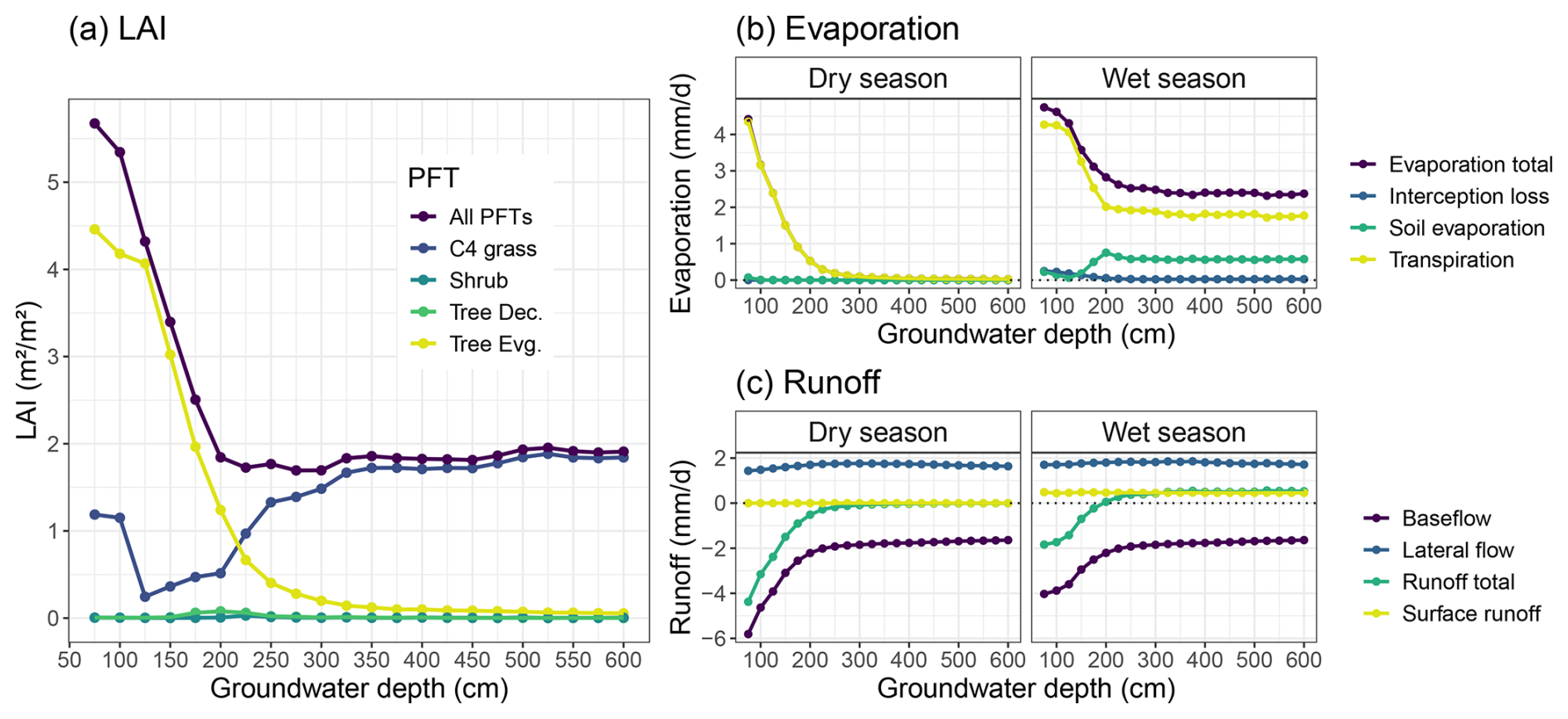 The new model version allows for using different bottom boundary conditions at any soil depth. For a second sensitivity test we analysed the impact of GWTD on dryland vegetation by activating the aquifer bottom boundary condition and running the model for different soil depths. Soil depth was varied by keeping the number of layers constant to 15 but changing the thickness of the bottom 10 layers. We again used the site simulation for Dahra as baseline, but now imposing an aquifer at depths ranging from 0.75 to 6 m in steps of 0.25 m, and analysed the simulated vegetation cover (LAI) and evaporation components, as well as the different runoff components as a function of water table depth. We also analysed the influence of groundwater depth on soil moisture and root water uptake for each soil layer, separated into the dry and wet season.