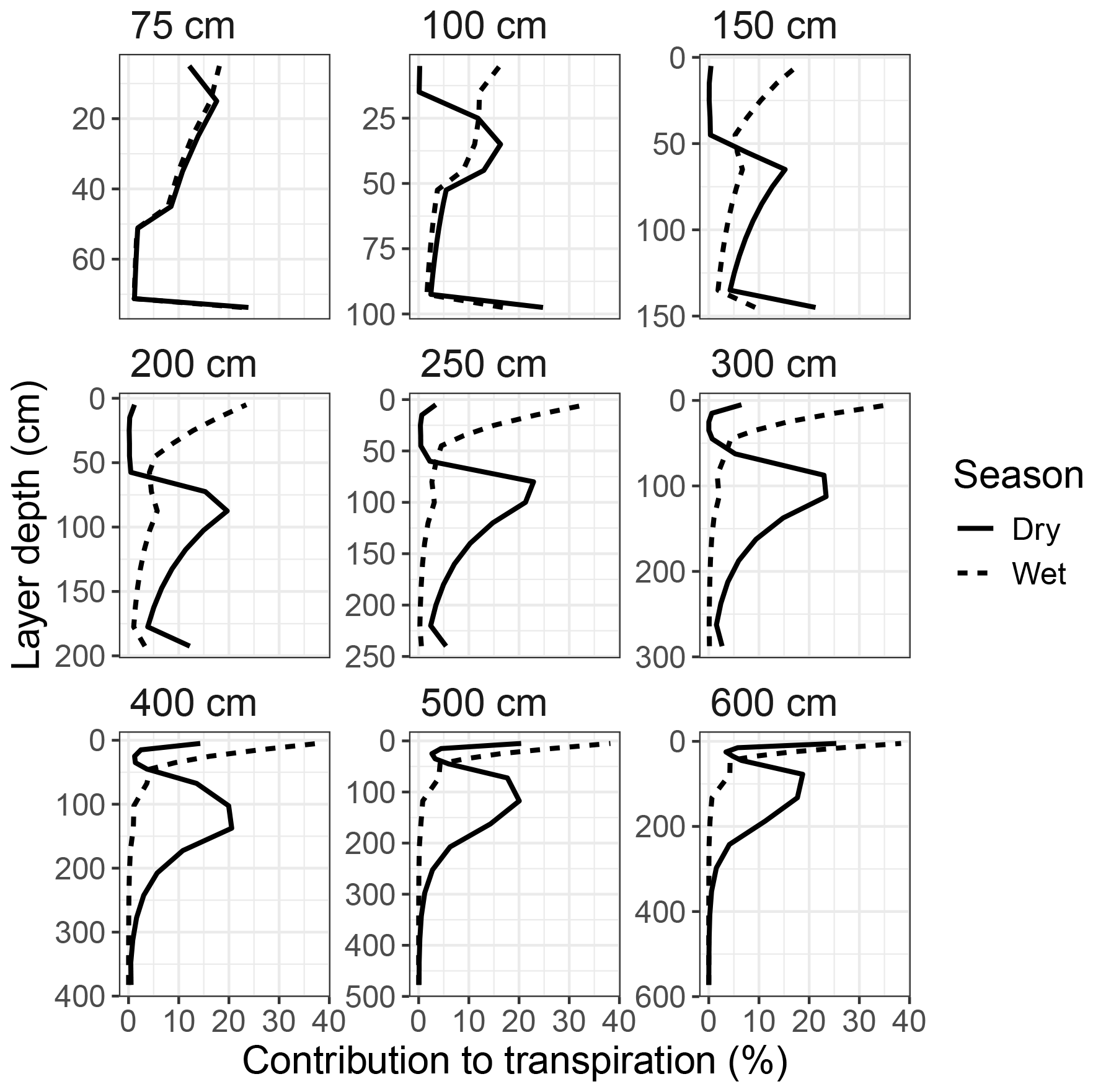Dryland ecosystems are globally important, as they account for about 40 % of Earth's terrestrial surface and net carbon uptake, while sheltering more than 30 % of the human population (Gilbert, 2011; Grace et al., 2006; Wang et al., 2012). Drylands have been shown to drive the interannual variability and long-term trend of the global land carbon sink (Ahlstrom et al., 2015; Poulter et al., 2014), and a 10 % increase in vegetation cover in semi-arid lands has been observed globally over the past decades (Ruehr et al., 2023). Recently, it has been shown that more than 30 % of global dryland ecosystems are dependent on access to groundwater, including several important global biodiversity hotspots, while more than half of these groundwater-dependent ecosystems are located in regions with declining groundwater trends (Rohde et al., 2024). Unsurprisingly, drylands are known to support trees with the deepest root systems over all biomes globally, with observed rooting depths down to 60 m in the soil, providing access to the groundwater table (Do et al., 2008; Fan et al., 2017).