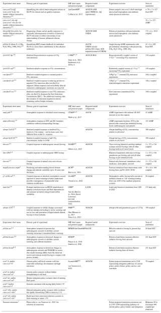 Table 3Overview of the CMIP7 AFT experiments with experiment name, experiment primary goal, MIP short name from which it is derived, required model components, brief experiment overview description, primary goal of combined experiments in the MIP from which it is derived, minimum number of years per experiment, and its main purpose. Forcings include greenhouse gases (GHGs), short-lived climate forcers (SLCFs), aerosols (AER), and carbon biogeochemistry (BGC). Superscripts on the experiment short name represent (1) prediction and projection, (2) attribution, (3) characterization, and (4) process understanding. Superscripts on the MIP indicate applicability of the experiments to the synthesizing research questions (Sect. 2) of (a) patterns of sea surface warming, (b) changing weather, (c) the water–carbon–climate nexus, and (d) tipping points. The esm prefix indicates that experiments are forced by CO2 emissions rather than CO2 concentrations. Note that for all AFT experiments that require a historical, present-day, or scenario forcing, the CMIP7 protocol requires slight modification of the original CMIP6 experimental design to be updated to CMIP7 historical (Sect. 3.1.2) and ScenarioMIP (van Vuuren et al., 2025) forcing.
