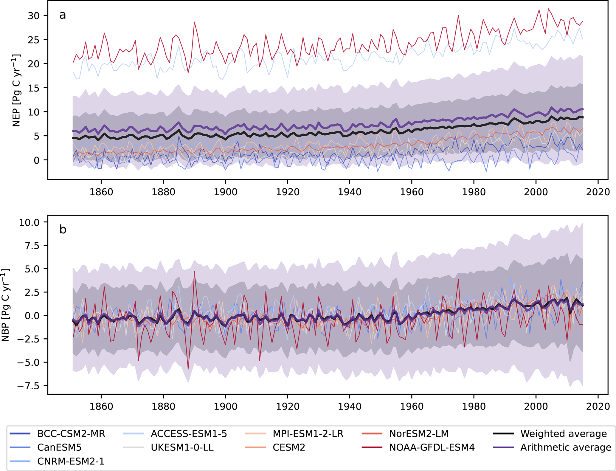 Figure 5Annual time series of (a) NEP and (b) NBP from individual CMIP6 ESMs obtained as arithmetic averages (purple lines) and the weighted averages using the method proposed here (black lines). Uncertainty ranges are calculated according to Eq. (28). For the arithmetic average, the weights for the computation of uncertainty are wi=1/8.