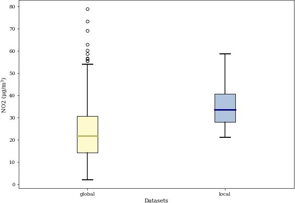 The global and local datasets include the annual mean NO2 concentrations (measured in µg m−3) for the year 2017 (OpenAQ, 2017; EEA, 2021). Figure 1 presents the distribution of NO2 concentrations at the global and local measurement stations. The terms “global” and “local” were chosen to reflect the relative scale of the datasets, with “global” representing a broader, cross-national dataset and “local” focusing specifically on Amsterdam. While the “global” dataset includes only two neighboring countries, this terminology emphasizes its wider scope compared to the local dataset. The global dataset comprises ground station measurements from Germany and the Netherlands, while the local dataset includes the Palmes data in the Amsterdam region.