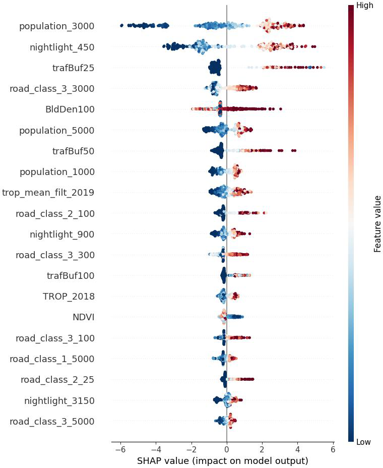 In this study, feature selection is guided by the out-of-sample performance in a random sampling validation repeated 10 times, where Shapley values are calculated for each iteration of the random forest models. Predictors are ranked based on the median Shapley value across all iterations. The relative positions of each predictor using the median-based approach are illustrated in Figs. S13 and S14, with the Shapley ranking of a single run shown in Fig. 2. The most influential predictors for the global models include nightlight intensity (450 and 3150 m buffers), population density (1000 and 3000 m buffers), road class (class 2 within 25 m and class 3 within 300 and 3000 m buffers), the annual mean NO2 column density of 2018 measured by the TROPOMI instrument on board Sentinel-5p (trop mean filter 2018), building density in the 100 m buffer, NDVI, and traffic buffers (25 and 50 m buffers). Descriptive statistics of the most influential predictors for the global models are in Table 2.
