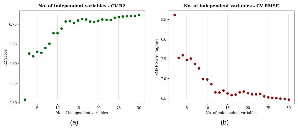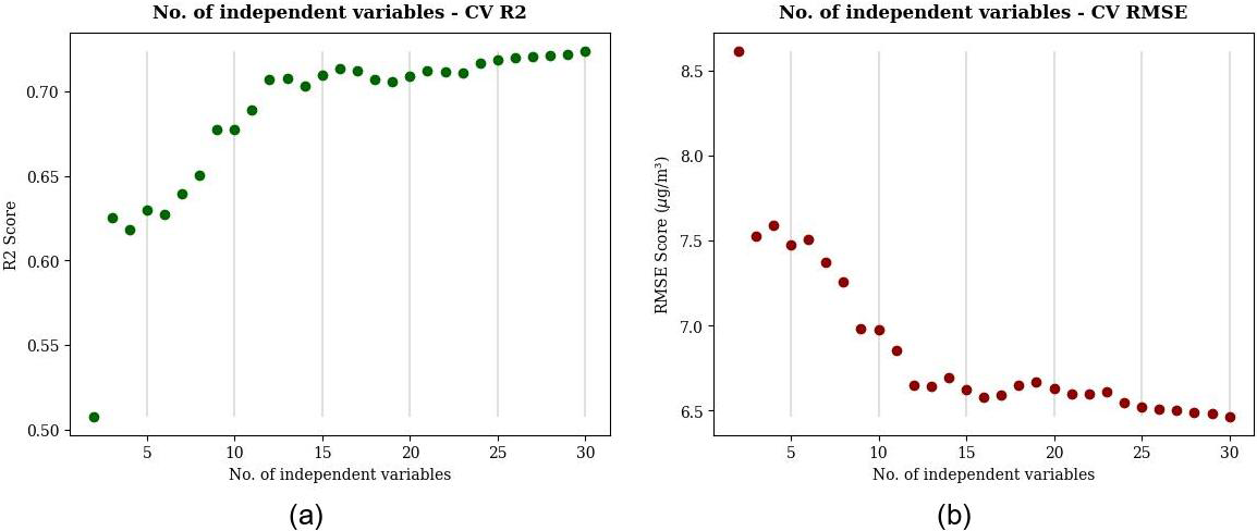 A random forest algorithm is applied iteratively to determine the optimal number of predictors, starting with the 2 most influential predictors and extending to the 30 most influential features. The RMSE and R2 metrics are used to evaluate the optimal number of predictors. The number of predictor variables and their corresponding evaluation scores (R2, RMSE) are shown in Fig. 3. In particular, prediction accuracy improves significantly when considering at least 12 predictors, but the improvement is marginal beyond this number.