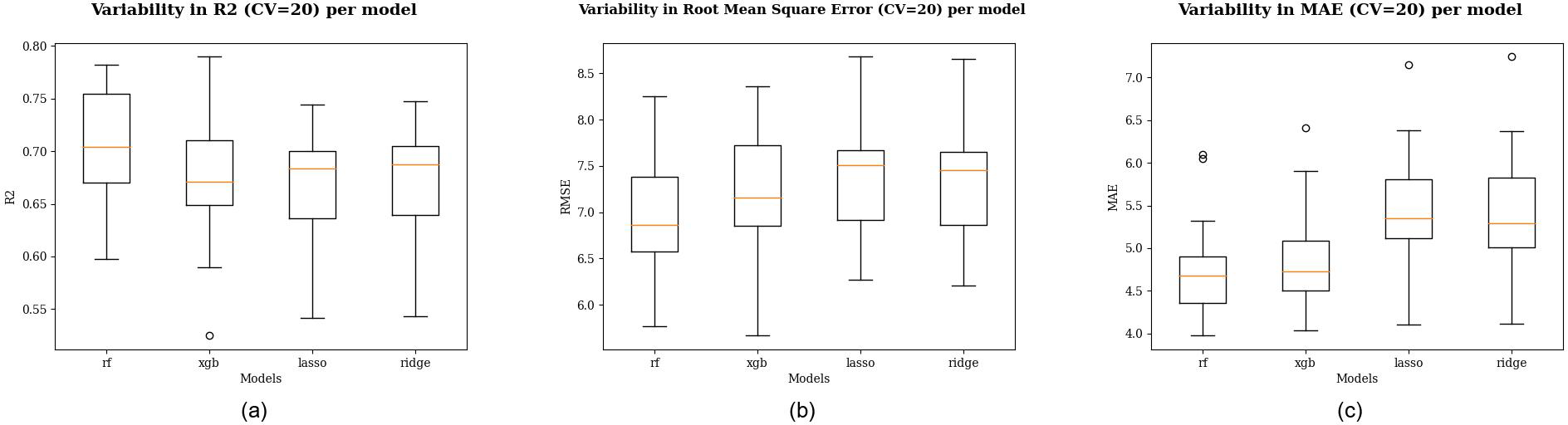 Evaluations of the different linear and nonlinear models were carried out using repeated random sampling validation (i.e., Monte Carlo cross-validation) performed 20 times. In each iteration, 90 % of the data was used for training and the remaining 10 % for testing. For testing model performance on spatial groups, 30 testing samples were used every time (Boersma, 2025a). This approach allowed us to evaluate the variance and median statistics for each model in terms of R2, MAE, and RMSE (Fig. 4). The repeated sampling provided stable estimates.