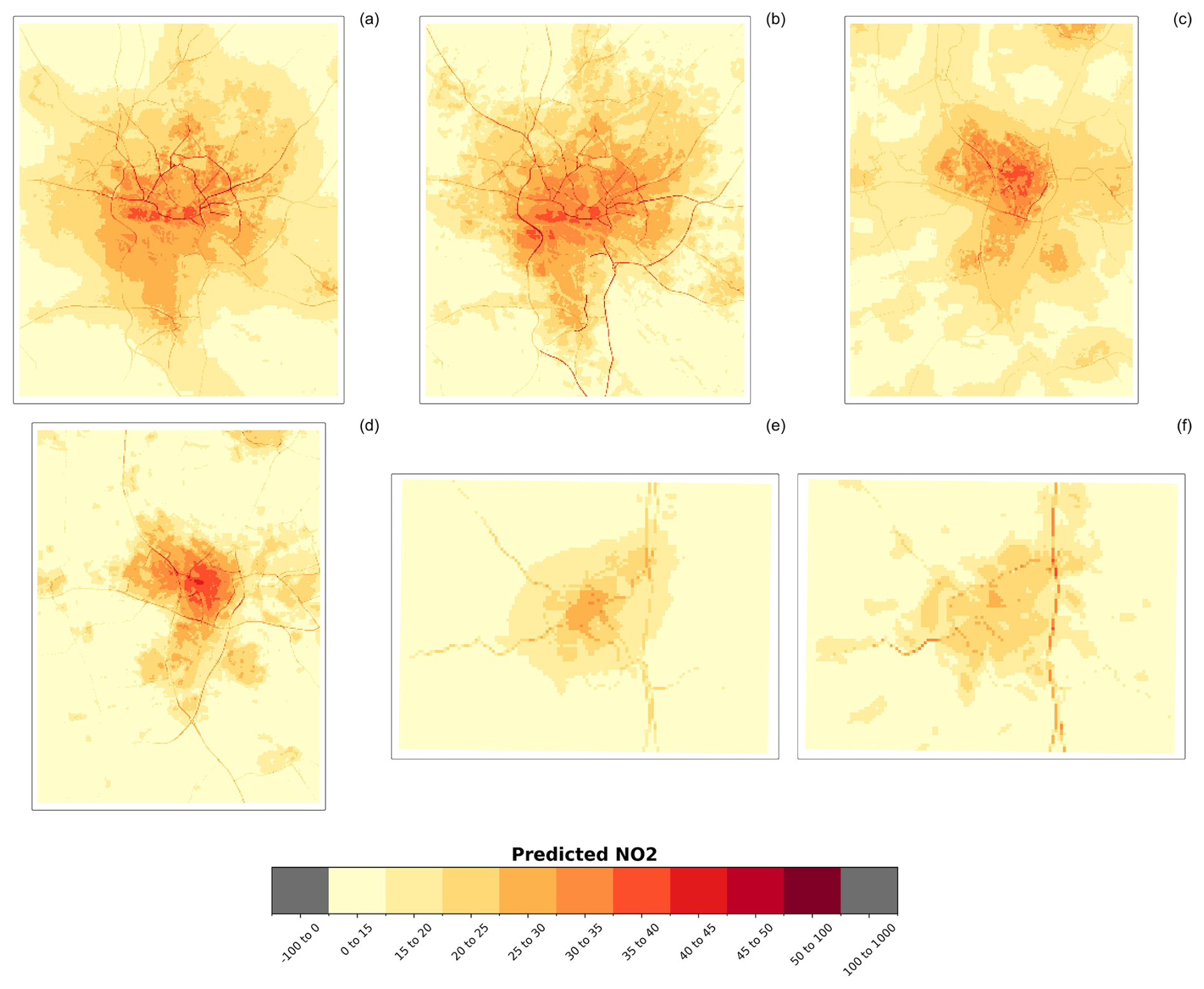 Figure 7Spatial patterns of predicted NO2 (µg m−3) at a 100 m resolution based on the local dataset – (a) linear model, (b) linear model separating for spatial groups, (c) mixed-effects model, (d) ordinary kriging, (e) universal kriging, and (f) universal kriging separating for spatial groups.