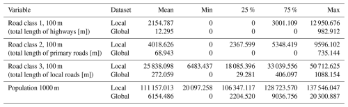 Table 1Descriptive statistics of variables determining the spatial groups for the local and global datasets. The statistics are derived from the station measurement locations. The distances in the “variable” column represent different buffer radii around measurement stations.