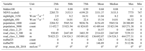 Table 2Descriptive statistics for global predictors. bldden100 = built area within a 100 m buffer, NDVI = normalized difference vegetation index, nightlight_3150 = nightlight in a 3150 m buffer, nightlight_450 = nightlight in a 450 m buffer, population_1000 = population in a 1 km grid, population_3000 = population in a 3 km grid, road_class_2_25 = total length of primary roads in a 25 m buffer, road_class_3_300 = total length of local roads in a 300 m buffer, road_class_3_3000 = total length of local roads in a 3000 m buffer, trafbuf25 = traffic count in a 25 m buffer, trafbuf50 = traffic count in a 50 m buffer, trop_mean_filt_2018 = TROPOMI 2018 mean vertical column density. Note that the NDVI has a scale factor of 0.0001.