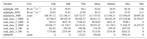 Table 3Descriptive statistics for local predictors. nightlight_450 = nightlight in a 450 m buffer, nightlight_4950 = nightlight in a 4950 m buffer, population_3000 = population in a 3 km grid, road_class_1_5000 = total length of highway in a 5000 m buffer, road_class_2_1000 = total length of primary roads in a 1000 m buffer, road_class_2_5000 = total length of primary roads in a 5000 m buffer, road_class_3_100 = total length of local roads 100 m buffer, road_class_3_300 = total length of local roads in a 300 m buffer, trafbuf50 = traffic count in a 50 m buffer.