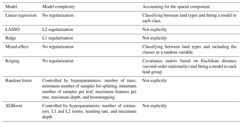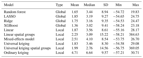 The global models use two types of statistical learning methods. The first group consists of ensemble-tree-based approaches, including the random forest and extreme gradient boosting (XGBoost). Hyperparameters are tuned based on cross-validation error. For the random forest model, the number of estimators is set to 1000, with a minimum sample split of 10, minimum samples per leaf of 5, maximum features per tree of 4, and a maximum depth of 10. The XGBoost model uses 10 000 estimators, with a reg_alpha of 2, reg_lambda of 0, max_depth of 5, and a learning rate of 0.0005 (see also Figs. S7 and S8). Additionally, the gamma for the XGBoost model is set to 5. Further details can be found in the Supplement (Sect. S1.1, “Parameters”, and Eq. S2; Boersma, 2025a). Additionally, the light gradient boosting (LightGBM) model was tested but did not yield significantly different results compared to XGBoost. The results of LightGBM analyses are shown in Figs. S9–S12.