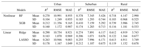 Table 9 provides model performance metrics for each spatial group, again using leave-one-out cross-validation. Consistent with the global model results, local models trained on urban observations tend to perform poorly. This poor performance is likely caused by an imbalance between the relatively small number of samples and the relatively high heterogeneity. This imbalance may hinder the models' ability to capture the variability within urban areas, contributing to their poorer performance in this group. Interestingly, proximity to roads does not necessarily correlate with model performance, as the suburban group exhibits a higher R2 than the rural group. Unlike global models, which perform best in rural areas, local models perform best in suburban areas. This difference may arise because observations in rural areas within the local dataset are more similar to those in urban and suburban areas than in the global dataset due to a more uniform distribution of predictor values.