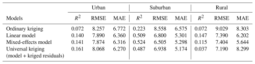 Table 9Model performance per spatial group (CV = leave-one-out cross-validation). RMSE and MAE are in µg m−3.