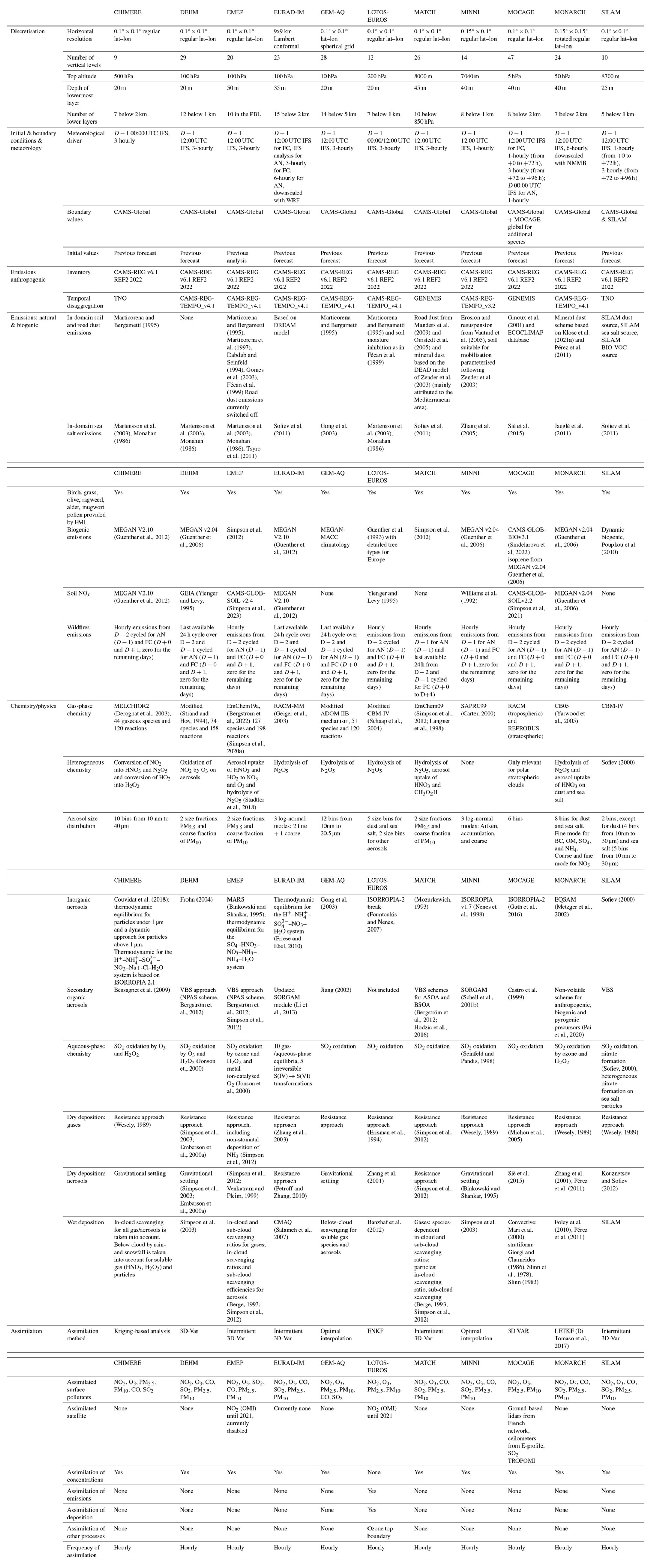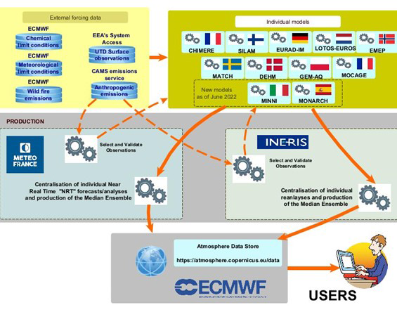The design of the system follows clear technical requirements in terms of consistency in the model setup and forcing fields (meteorology, surface anthropogenic emission fluxes, and chemical boundary conditions). But it also benefits from a diversity in the description of atmospheric processes through the design of the 11 European chemistry-transport models (CTMs) involved.