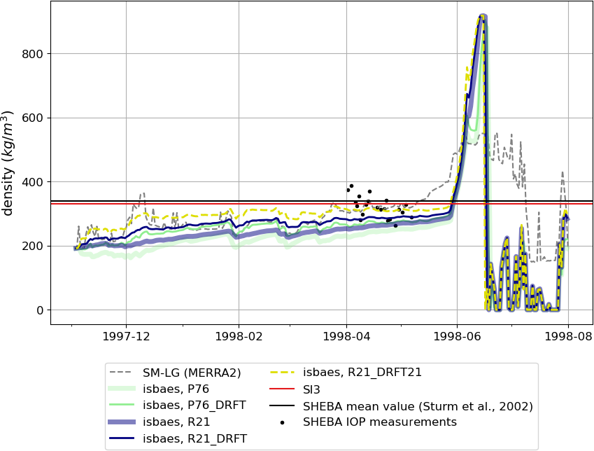 The first-order discrepancies in snow thickness between the different ISBA-ES simulations are related to the density of snow: since during compaction processes the mass remains constant, a denser snow will be associated with a thinner snowpack and vice versa. The evolution of the density during the SHEBA period is represented in Fig. 4. For the ISBA-ES simulations, the mean densities over this period are 225.6, 260.7, 244.6, 275.5, and 303.9 g m−3 for P76, P76_DRIFT, R21, R21_DRIFT, and R21_DRIFT21, respectively, which is slightly lower than the average bulk density of 340 g m−3 measured during SHEBA by Sturm et al. (2002) and with the mean densities of SnowModel_LG outputs (281.8 g m−3 when forced by MERRA-2 and 263.0 when forced by ERA5). Better agreement with the SnowModel-LG depth-averaged density is found for the ISBA-ES simulations using the snowdrift parameterization (P76_DRIFT and R21_DRIFT).