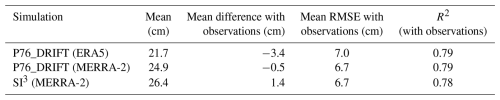 Figure 3 depicts the aggregated snow thickness from all SHEBA transects compared to our simulations and to SnowModel-LG outputs. The scores obtained for each simulation are summarized in Table 4. Overall, all simulations compare reasonably well with the measured snow thickness from SHEBA during the accumulation period. The best scores are nonetheless obtained for the P76_DRIFT simulation (see Table 4). As expected, the snowdrift parameterization tends to reduce the snow thickness through snow compaction by ∼ 3.9 cm (P76 – P76_DRIFT) on average over the period for the default parameters and by ∼ 5.1 cm with the Royer et al. (2021) parameters for the snowdrift and the snowfall density (R21 – R21_DRIFT21). The choice of the parameterization for the snowfall density and for the snowdrift results in an average change in snow thickness of approximately 3.9 cm in ISBA-ES simulations (P76_DRIFT – R21_DRIFT21), which is roughly the same order of magnitude as the thickness change associated with the choice of atmospheric forcing (see Sect. 3.1.1).