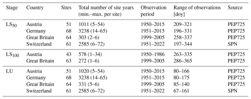 Note: LU refers to the stage when 50 % of the leaves are unfolded. LS50 and LS100 refer to the stages with 50 % and 100 % of the leaves, respectively, having changed color or having fallen. The timing of these stages is given by the day of year (doy). A site year is a year for which an observation of both LU and LS50 or LS100 was recorded at a given site. Two data sources were considered: PEP725 (Templ et al., 2018) and the Swiss phenological network (SPN; Swiss phenology network, 2025).