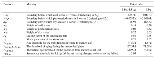 We tested 34 formulations of the leaf development process through 1428 calibration runs, and found that three subsequent leaf development phases resulted in the most accurate model (according to the AICc; Figs. 3a, c, 6, and S1–S2 in the Supplement). In this model, the phase “young leaf” starts with leaf unfolding. As a daily aging rate RAging accumulates (Eq. 10), the simulated state of aging increases by 1 day per day. When this state reaches the threshold YAging,1 (Eqs. 1 and 2), the phase “mature leaf” begins. During this phase, the leaf continues to age and is also sensitive to stress caused by cold days, shortening days, and dry days, to which we hereafter refer to as “cold stress”, “photoperiod stress”, and “dry stress”, respectively. This stress is summarized in a daily stress rate (RStress; Eq. 11) and thus accumulated to determine the state of stress. The first day that either the state of stress or the state of aging reaches the respective thresholds YStress or YAging,2 (Eqs. 1 and 2), senescence is induced, while the phase “old leaf” starts only when the state of aging reaches YAging,2. Once senescence is induced, a daily senescence rate (RSenescence) in convex dependence on stress accumulates (Eq. 12) and determines the state of senescence. The days this state reaches the thresholds YLS50 and YLS100 (Eqs. 1 and 2) correspond to the predicted dates of LS50 and LS100, respectively. Hereafter, we refer to this model as “DP3” model (Tables 2 and 3; Meier, 2025b, coded in R).
