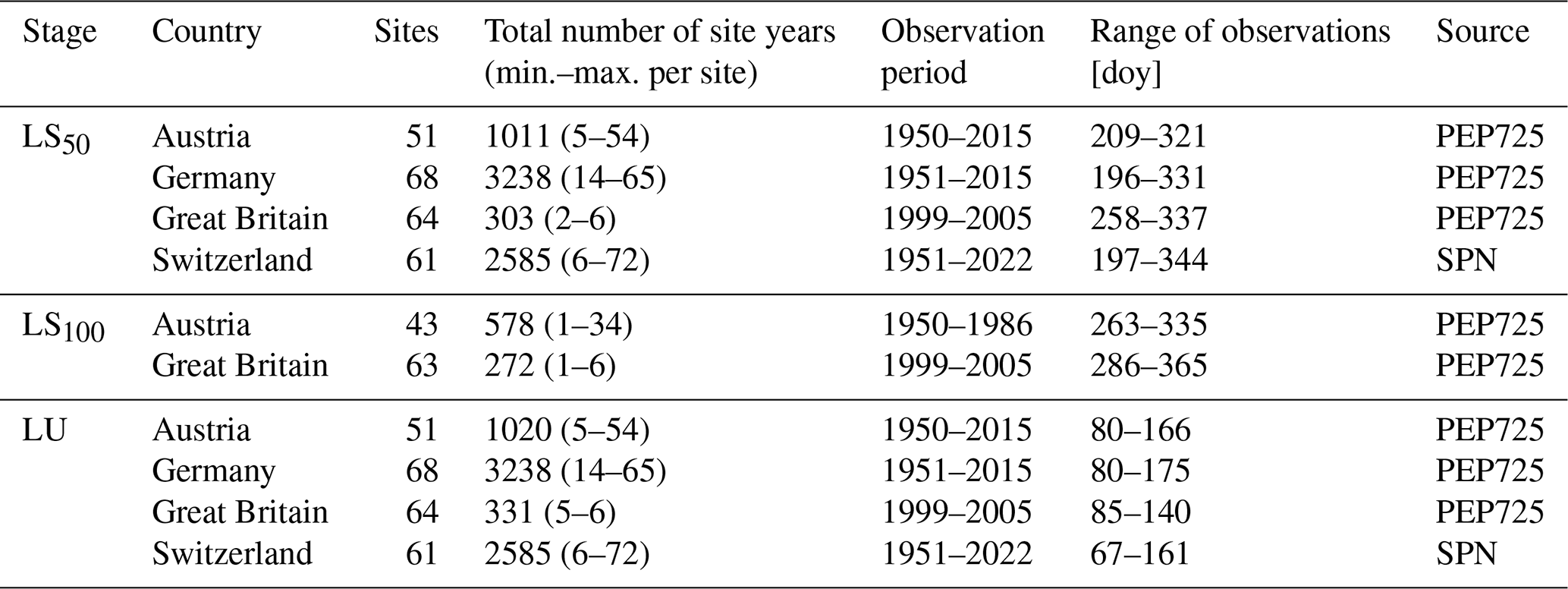Note: LU refers to the stage when 50 % of the leaves are unfolded. LS50 and LS100 refer to the stages with 50 % and 100 % of the leaves, respectively, having changed color or having fallen. The timing of these stages is given by the day of year (doy). A site year is a year for which an observation of both LU and LS50 or LS100 was recorded at a given site. Two data sources were considered: PEP725 (Templ et al., 2018) and the Swiss phenological network (SPN; Swiss phenology network, 2025).