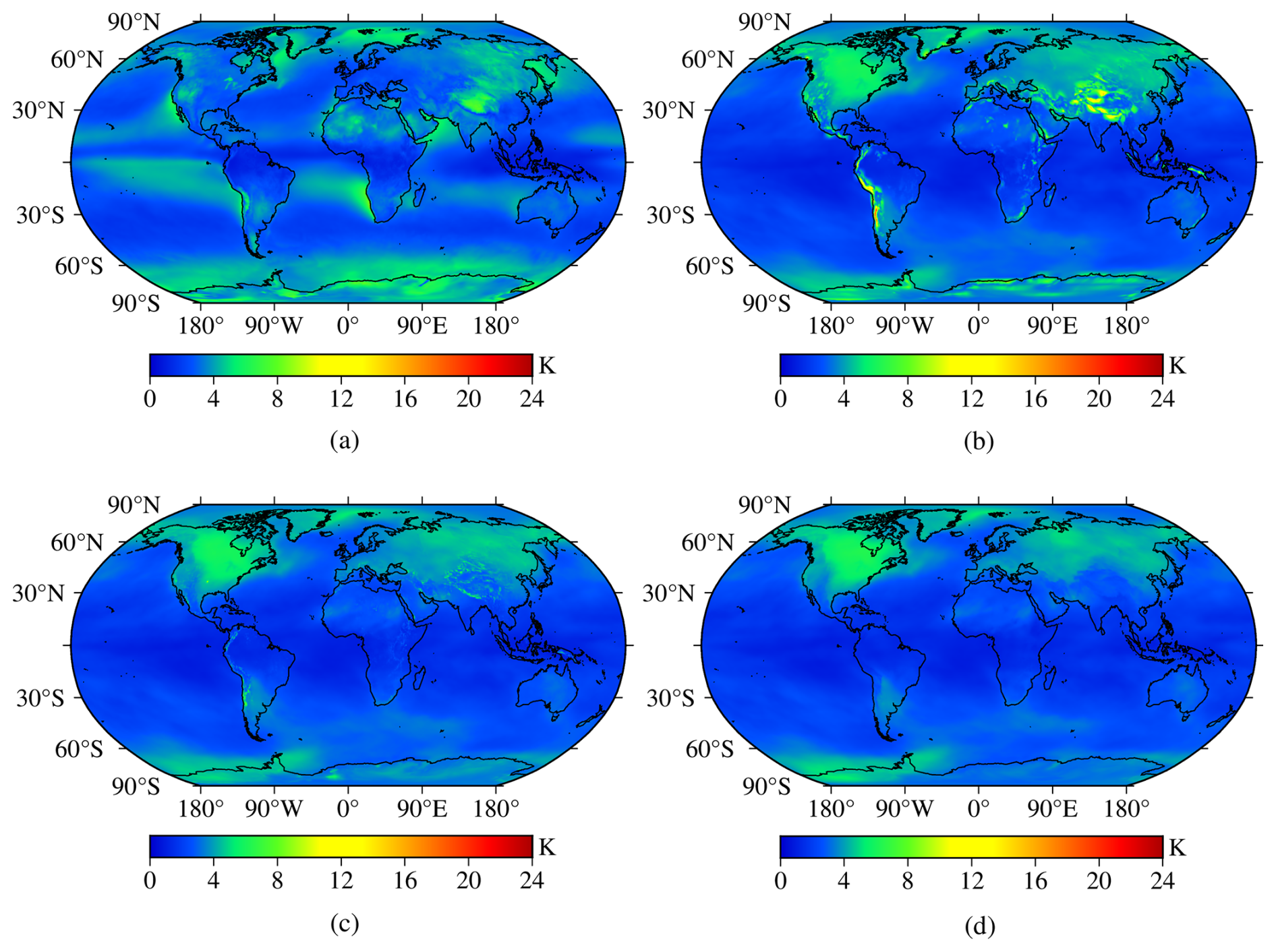 Figure 7The RMSE distributions of the four models tested using global surface gridded Tm data from the ERA5 reanalysis product in 2017. (a) Bevis model. (b) GPT3-5 model. (c) GPT3-1 model. (d) NGGTm model.