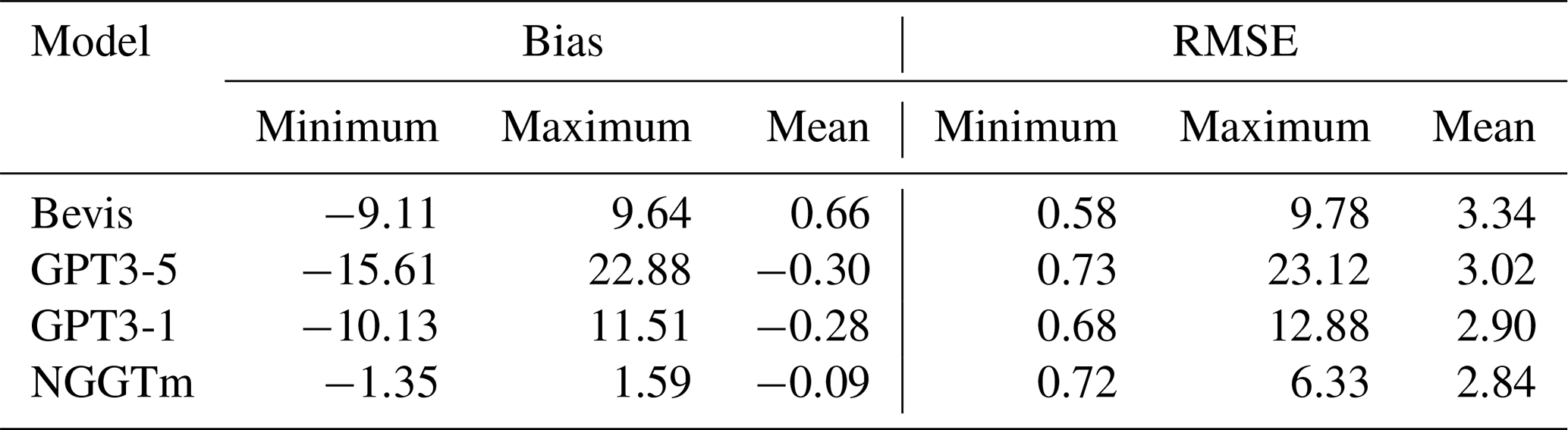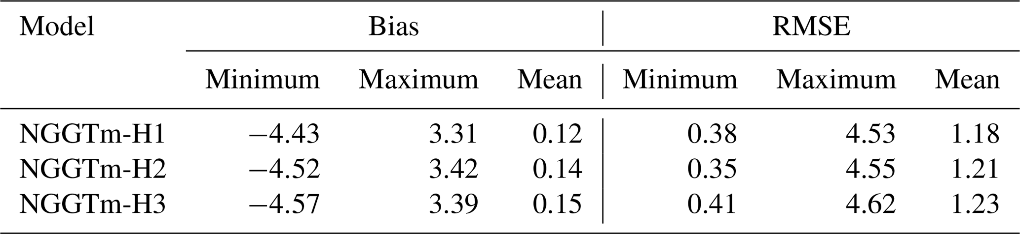 From Table 3, the mean bias of the NGGTm model was only 0.10 K, with the smallest absolute value among the analysed models. The bias range of the NGGTm model was also the smallest, ranging from −4.31 to 3.78 K, which demonstrated that the NGGTm model performed better than the other models. In addition, the mean RMSE of the NGGTm model was only 3.30 K, which exhibited improvements of 0.27 K (8 %), 0.35 K (11 %) and 0.18 K (5 %) over the Bevis model, GPT3-5 model and GPT3-1 model, respectively. The RMSE range of the NGGTm model was the smallest, ranging from 0.99 to 5.17 K, indicating that the NGGTm model had the best precision and stability at the global scale.