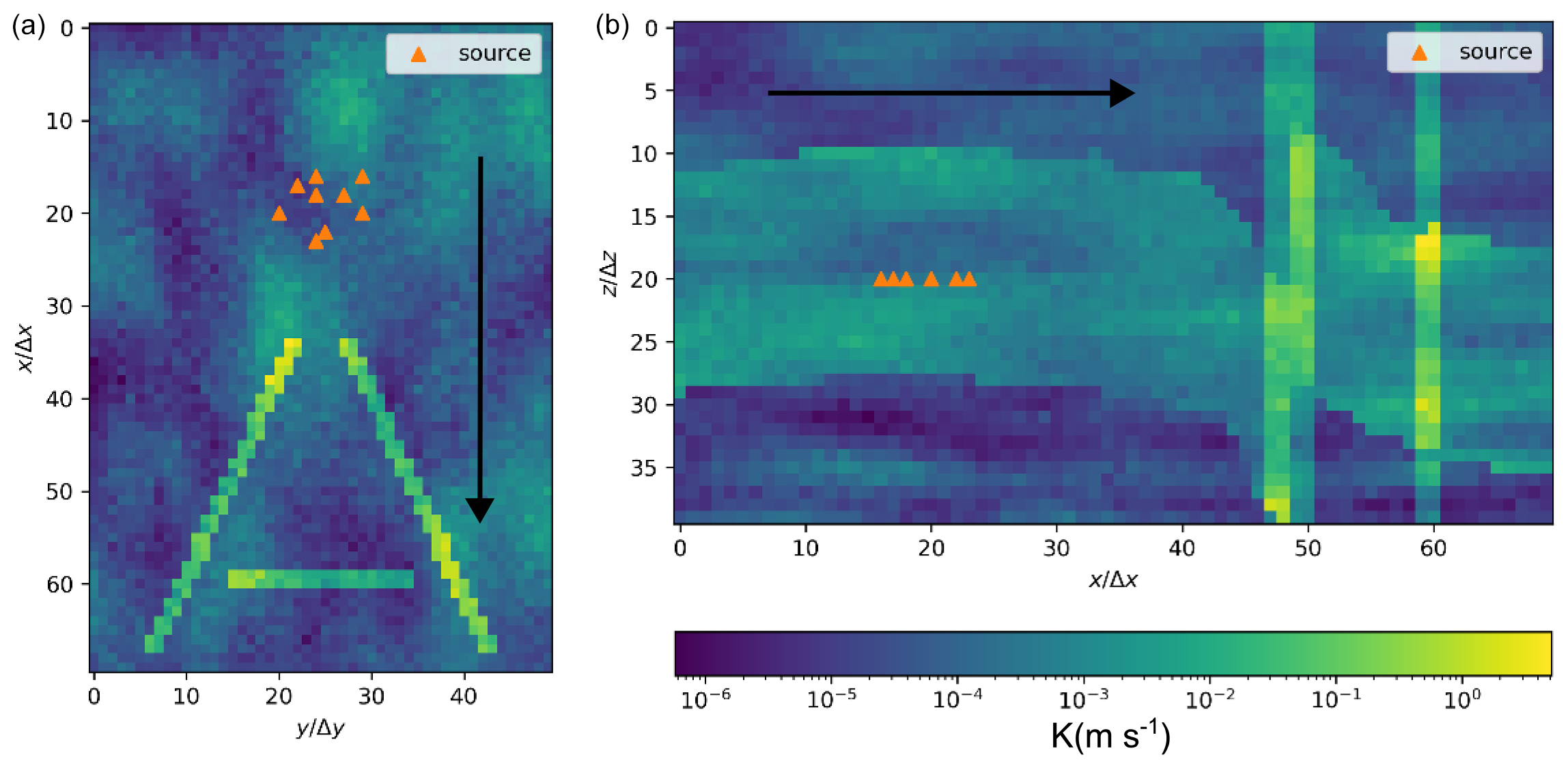 Figure 2Sections of the hydraulic conductivity field (in m s−1) for the fault scenario , where all three faults act as pathways (i.e., increase conductivity). The hydraulic conductivity field is generated using a multi-Gaussian spatial random field model with heterogeneous geological units. (a) Horizontal section at depth index . (b) Vertical section at lateral index . Fault planes are vertical and orthogonal to the x–y plane. The orange dots represent the possible contaminant injection locations. The black arrow indicates the main direction of flow (along the x axis). Axes are labeled in terms of discretization units.