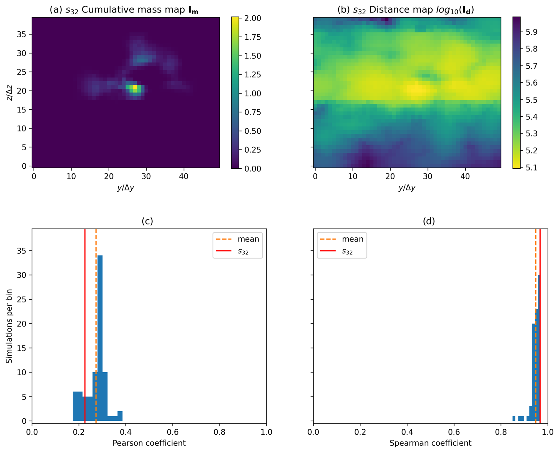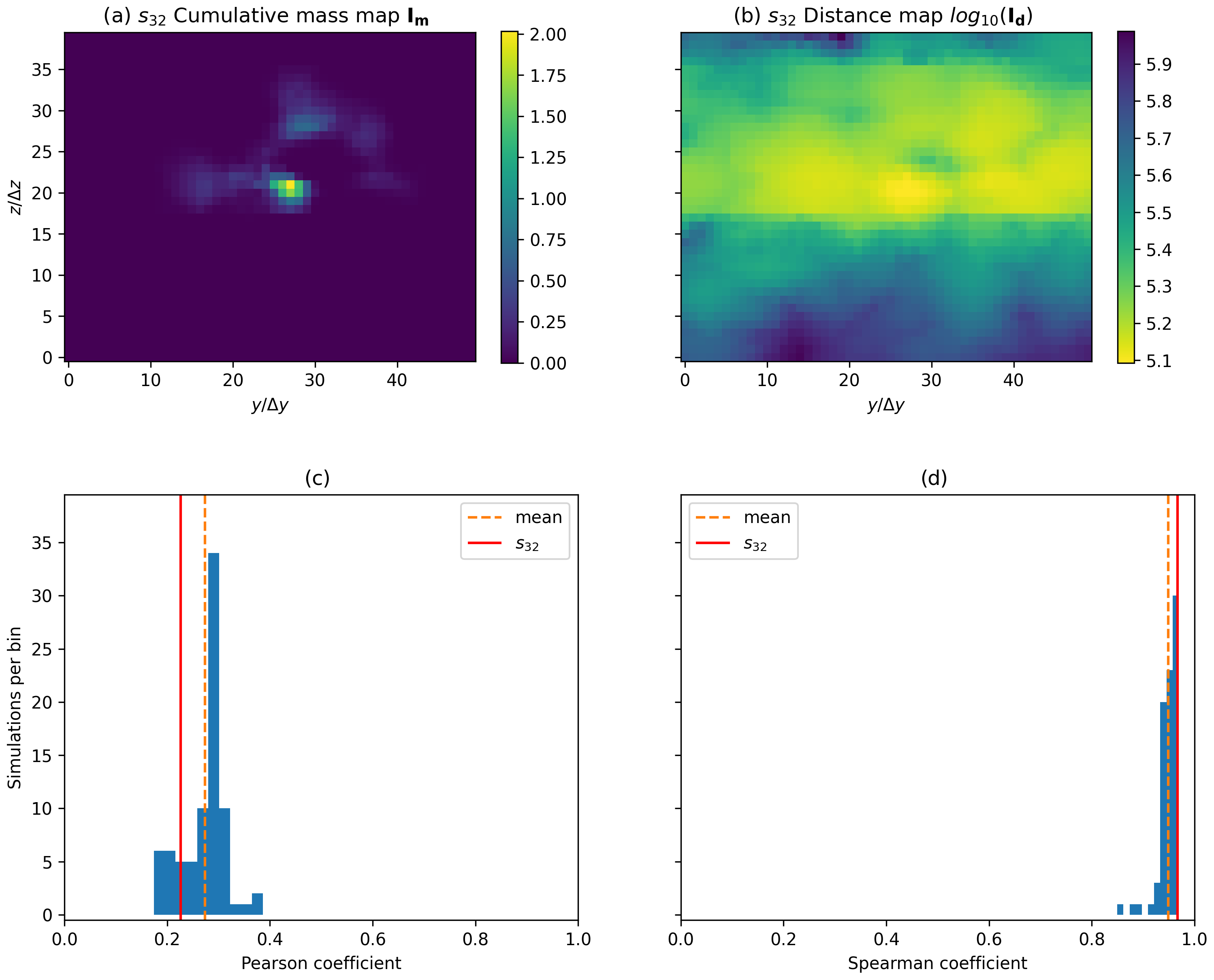 Figure 3(a) Map of the cumulative mass at FTA for scenario 32. (b) Map of distances between the source and the model outlet face for scenario 32. Both maps are plotted on the outlet face located at x=7000 m using discretized coordinates and . (c, d) Histogram and mean of two correlation coefficients between the negative of the distances and the cumulative mass over all 80 of the scenarios.
