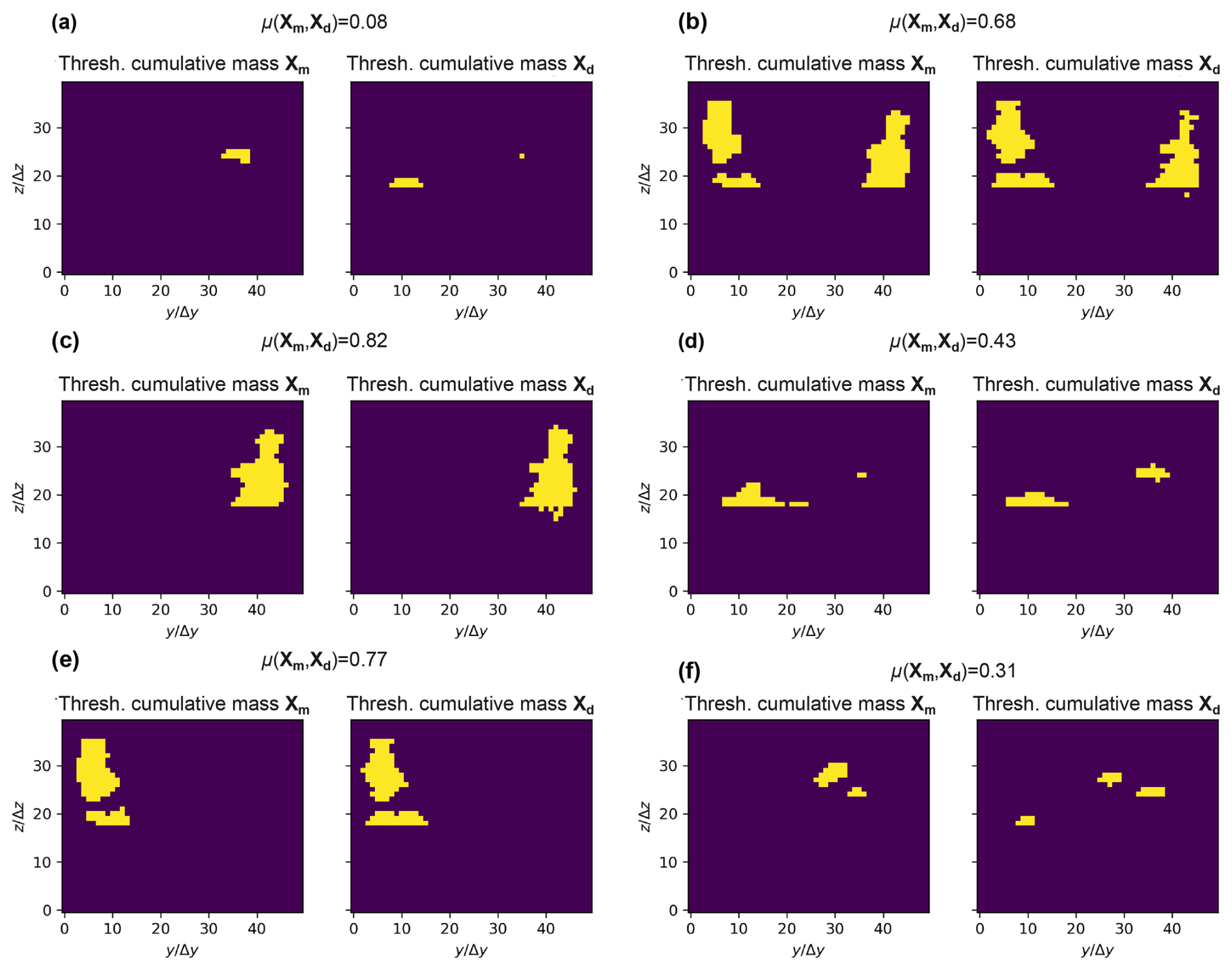 Figure 5Computation of the similarity for scenarios 0 (a), 76 (b), 36 (c), 8 (d), 27 (e), and 10 (f). For each case, on the left side is the cumulative mass (Xm) at FTA from MODFLOW 6 to which an Otsu thresholding is applied. On the right side, the map of distances (Xd) is shown, thresholded with the same number of pixels as for the cumulated mass map. The similarity values are shown on the top of each figure. The axes are expressed in discretization units.
