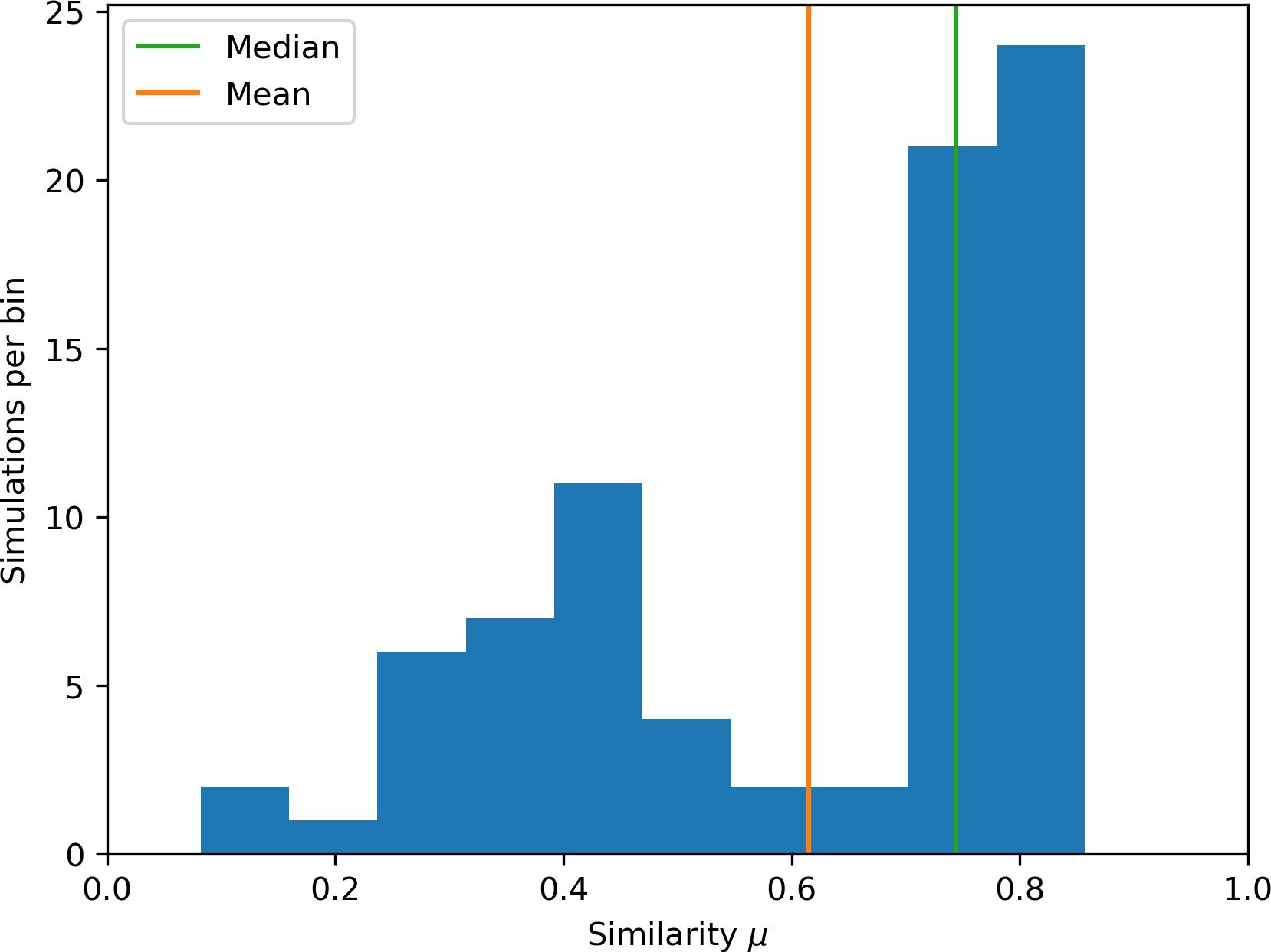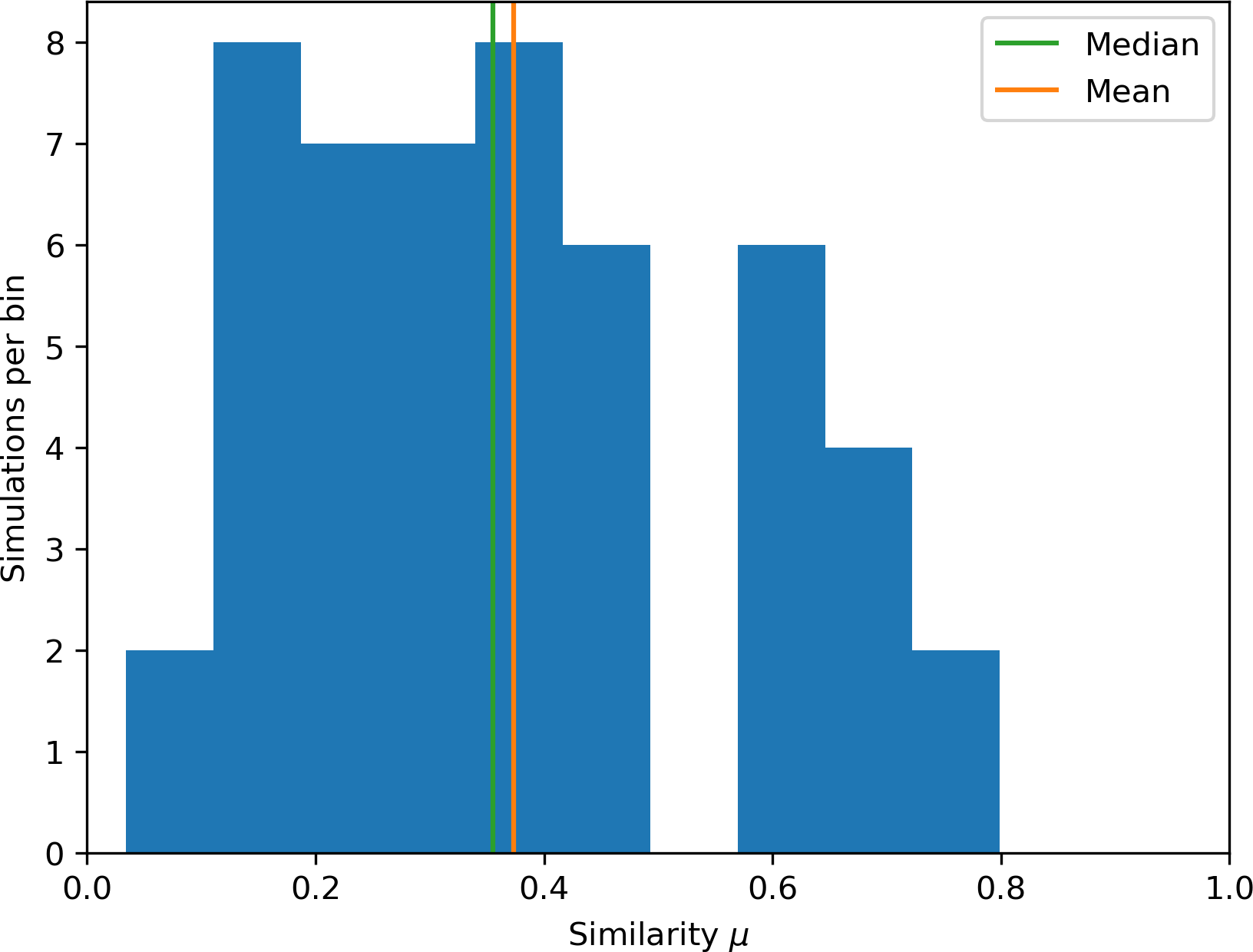 Figure 6Histogram of similarity index values computed over all 80 scenarios using the similarity formula from Eq. (9). For each scenario, the similarity was calculated between the cumulative mass map at FTA and the corresponding distance maps.