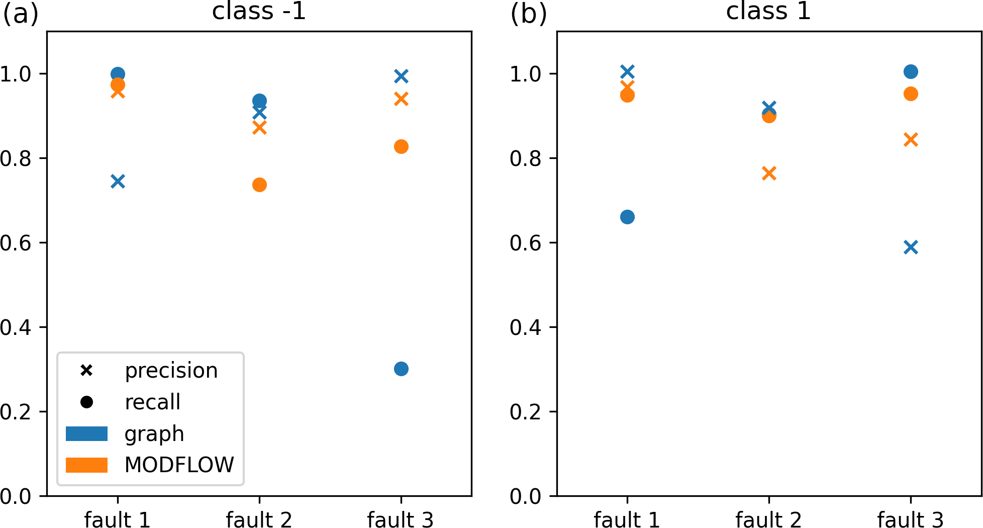 The results of the average success rate , computed over pairs (80) of fault scenarios (8) and contaminant sources (10), as a function of the average number of selected scenarios , are presented in Fig. 8. It is evident that all data points lie significantly above the baseline curve of the hk functions. Specifically, selecting the gλ function for λ=0.5 yields a precision of and an average number of selected scenarios , which can be interpreted to be a confidence of 80 % to select the right scenario when selecting the two best scenarios. Close results are obtained with the u function. This shows that, with this method, we are able to confidently reject a good portion of the scenarios. Using the probabilities calculated in Eq. (14), we can then calculate the recall and precision for each fault in predicting its behavior. Because there are two possible classes (barrier or path), recall and precision are calculated for both classes. The results are shown in Fig. 9 with blue markers. Additionally, in Fig. 9, the recall and precision scores obtained using the cumulative mass results from MODFLOW 6 from start to finish are shown with orange markers. The fact that the precision and recall are not equal to 1 demonstrates the inherent lack of variability in the data; i.e., there exists ambiguity between scenarios that cannot be resolved when using the physics-based solver. Even with perfect measurement, we cannot determine the nature of each fault with certainty a posteriori.