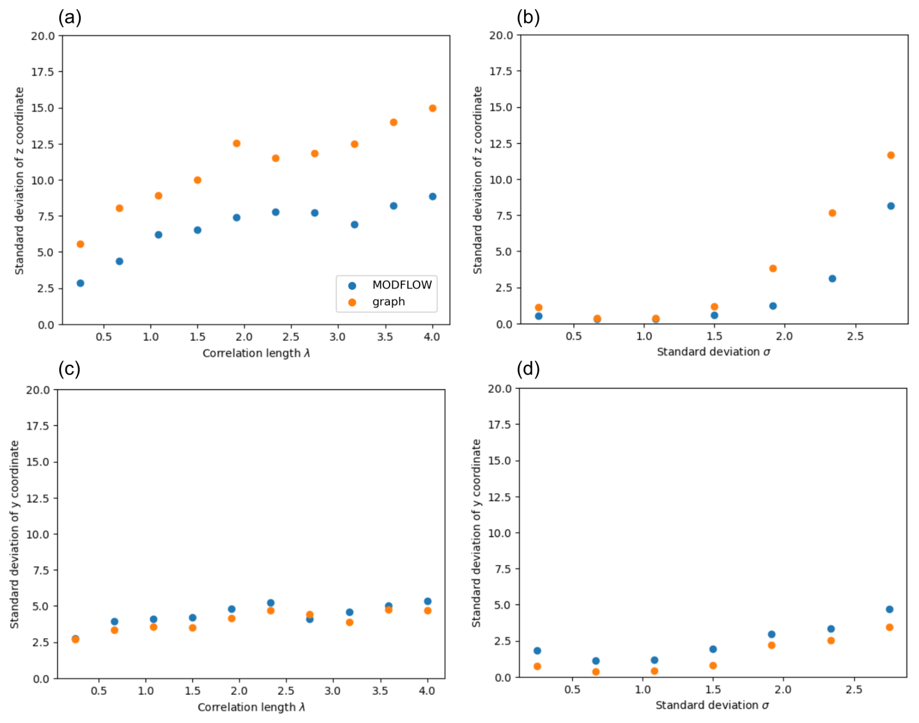 Starting from reference values for the standard deviation σ0 and the correlation length λ0, we successively apply a factor to vary both parameters. The variable we will focus on is the standard deviation of the position of the point of maximum cumulative mass at the FTA (respectively, the point of minimal distance). For each standard deviation σ and correlation length λ, we generated 50 realizations of the MG field and calculated the standard deviation of the coordinates of the point of maximum cumulative mass at the FTA (respectively, the point of minimal distance). This represents the uncertainty of the result for the fixed parameters of standard deviation σ and correlation length λ considering the fact that the exact structure of the conductivity field is often unknown. By decomposing the results on the y and z axes, we can visualize the results in Fig. A2. We can observe that, in all cases, the results from Dijkstra's algorithm follow the trends of the MODFLOW 6 results. Moreover, these trends are consistent with previously observed results in the literature: as the correlation length and standard deviation increase, the uncertainty also increases. We can also notice the standard deviations from Dijkstra's algorithm are either equal to or significantly greater than those from MODFLOW 6. This means that the uncertainty related to the structure of the conductivity field is not underestimated by Dijkstra's method.