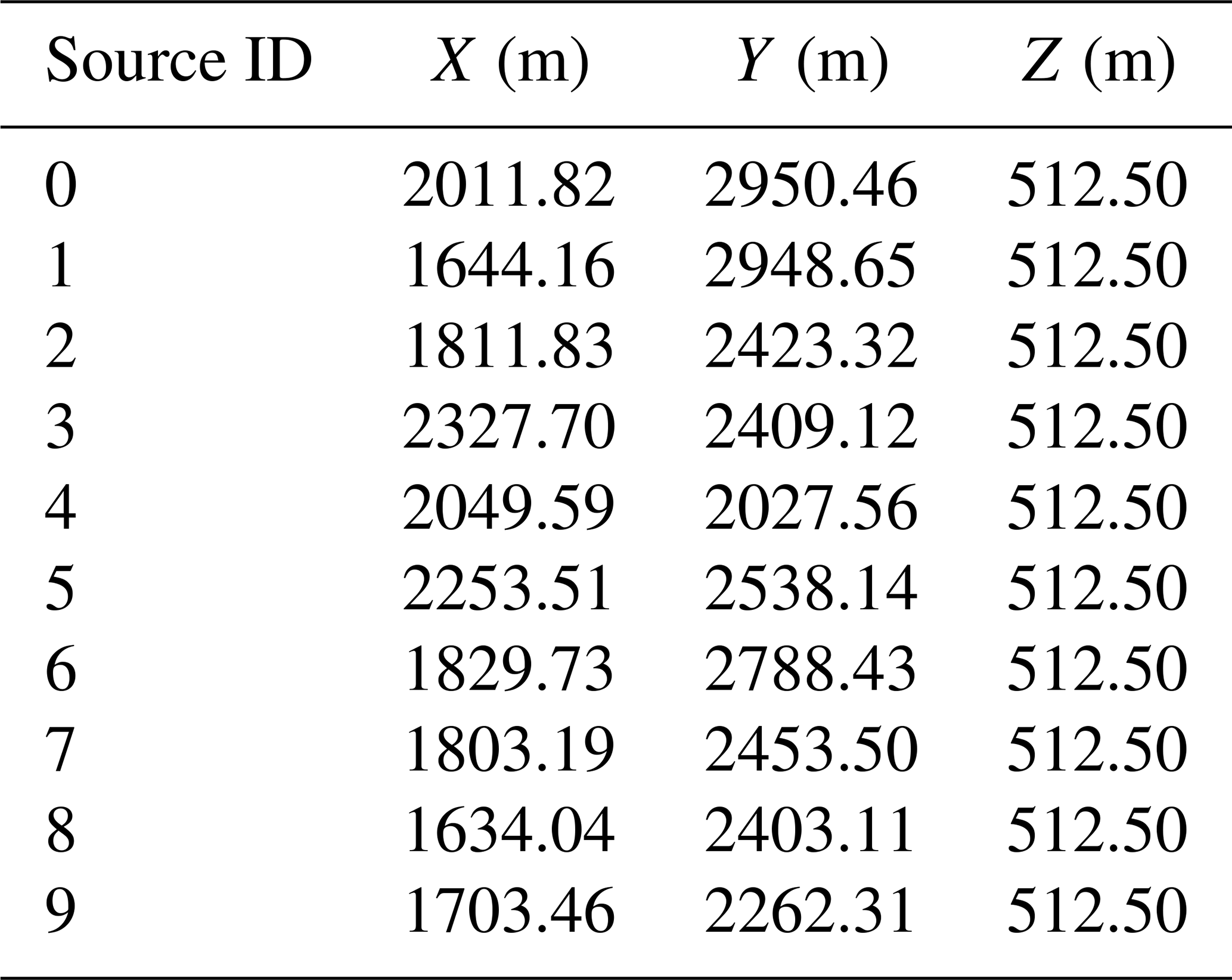 For this paper, we consider the following synthetic case, depicted in Fig. 1: a fault zone with three vertical faults and three geological units, each characterized by different heterogeneous property field parameterizations, whose properties are detailed below. The flow propagates primarily in the x direction, with the system's inlet and outlet being maintained at a constant head. A contaminant is continuously injected into approximately the middle of the model, and we study the transport of this contaminant until it exits the model at its outlet face. Flow in a heterogeneous porous medium is modeled using Darcy's law in conjunction with the continuity equation, which, together, describe fluid motion based on the principle of mass conservation. Contaminant transport is modeled using the advection–diffusion equation (ADE), which is based on Darcy's law for advection and Fick's law for diffusion and dispersion. The flow and transport equations are solved using a finite-difference solver, applied on a structured mesh. Faults influence the transport of the contaminant by locally altering the hydraulic conductivity. In this synthetic case, we assume that the faults can either increase or decrease the conductivity by a factor of 100 with respect to the value assigned by the underlying multi-Gaussian field in the absence of faults. As such, faults can act as either a pathway (1) or a barrier (−1). Considering all possibilities, there are eight possible fault scenarios, designated by a triplet belonging to . The highly schematic geometry of the faults was chosen to maximize the variability of the plume depending on the behavior of the faults. We add further variability by testing 10 possible source positions (Table 1), chosen randomly around a reference point with the coordinates xs=2000 m, ys=2500 m, and zs=512.5 m. This results in a total of 80 scenarios, numbered from 0 to 79, where the tens digit refers to their fault scenario and the units digit refers to the source position.