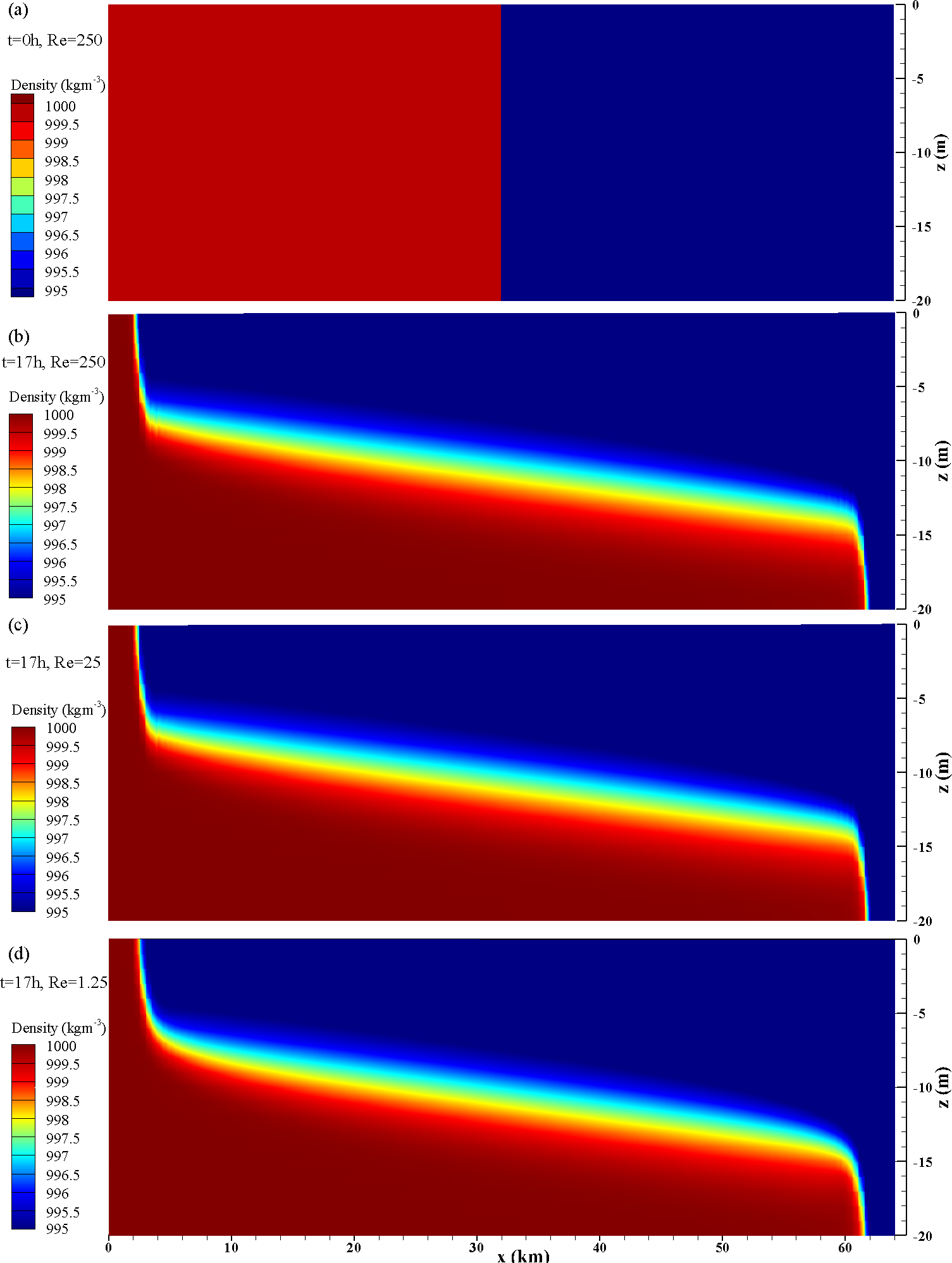 Figure 3a shows the initial density field, and Fig. 3b–d are the density fields at the time of 17 h, where the Re values are 250.0, 25.0, and 1.25, respectively. It seems that as the Re decreases, the density front becomes smoother, indicating that the increase in background viscosity reduces overall mixing within the system. To quantify the role of spurious mixing, we also use a reference potential energy (RPE), which can be defined as