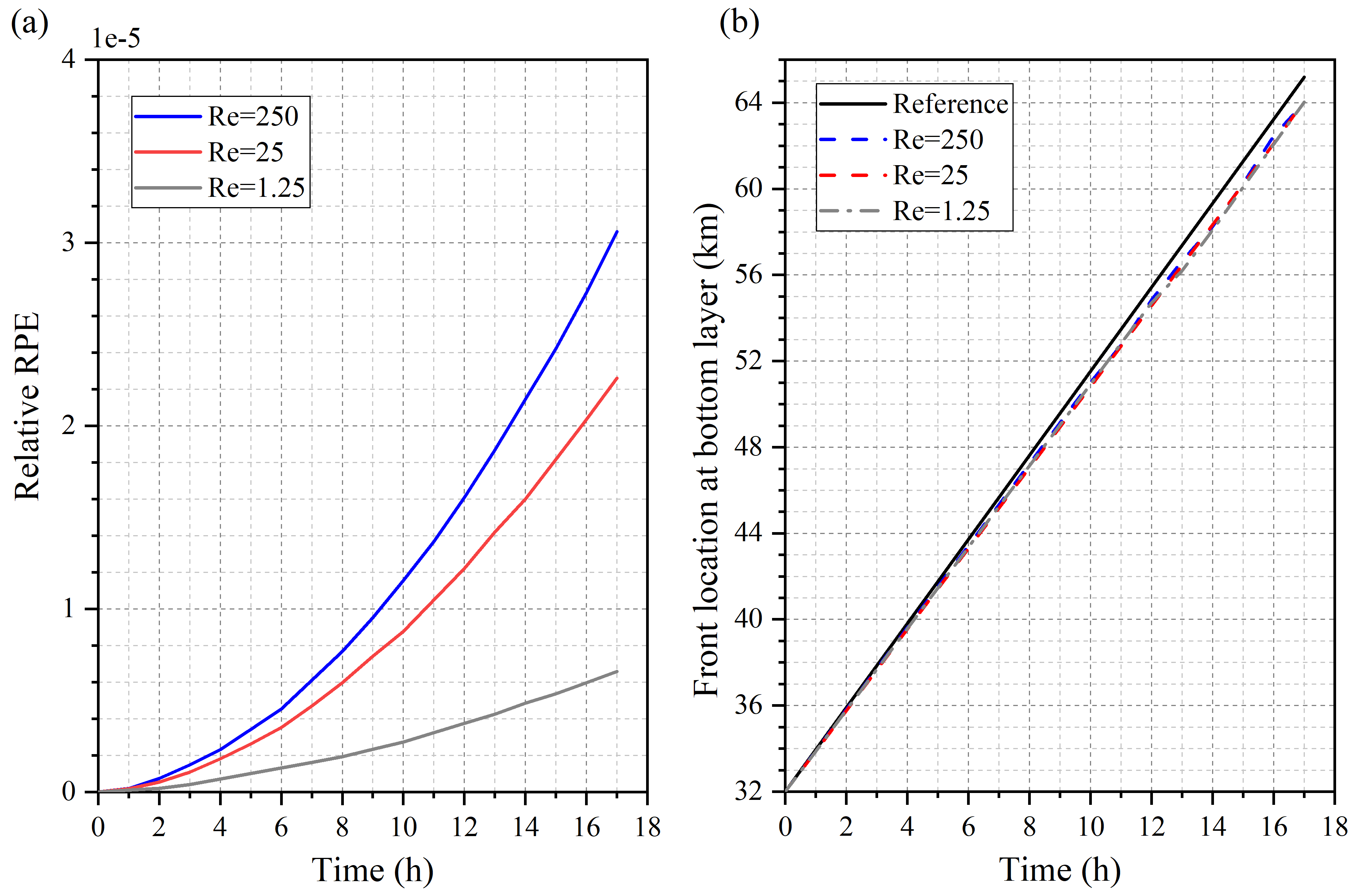Figure 4Simulation results of (a) relative RPE and (b) the density front location at the bottom layer of the lock exchange test with different Re.