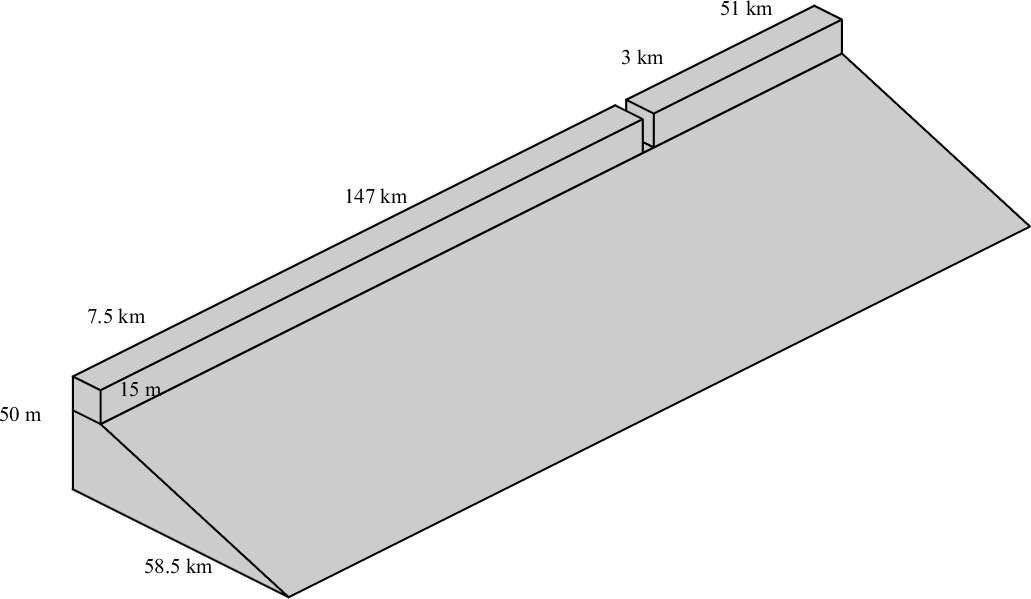 In addition to estuarine freshwater plumes, another phenomenon related to saltwater and freshwater interactions is saltwater intrusion into estuaries under tidal forcing. In this section, a semi-enclosed idealised river channel is configured, as shown in Fig. 10. This test case follows the setup described by Chen et al. (2022), with the computational mesh redefined accordingly. The channel is 15 km long, 3 km wide, and 10.2 m deep, with an initial salinity of 0. The channel features a riverbank slope of 0.033 and a floodplain slope of 0.0007. The right boundary is open to the sea, with a salinity of 35 psu, where a semi-diurnal tide with a 1 m amplitude is applied. The water temperature is uniformly set to 20 °C. Given that existing 3D DG baroclinic models lack empirical validation for handling WD processes, this test examines the model's applicability and reliability in solving the salinity transport equation in the presence of WD boundaries. The computational domain features a grid resolution ranging from 200 to 800 m, with the vertical dimension divided into 10 layers. The model operates with a time step of 0.2 s. The linear state equation is applied again, with αT=0, βS=0.714, T0 = 20 °C, and S0 = 35 psu, to update the density. The horizontal and vertical viscosities are set to 0.01 m2 s−1, the bottom friction coefficient is set to 0.005, and the threshold water depth is set to 0.05 m. The limiters mentioned in Sect. 2.3 are all applied to maintain robustness.