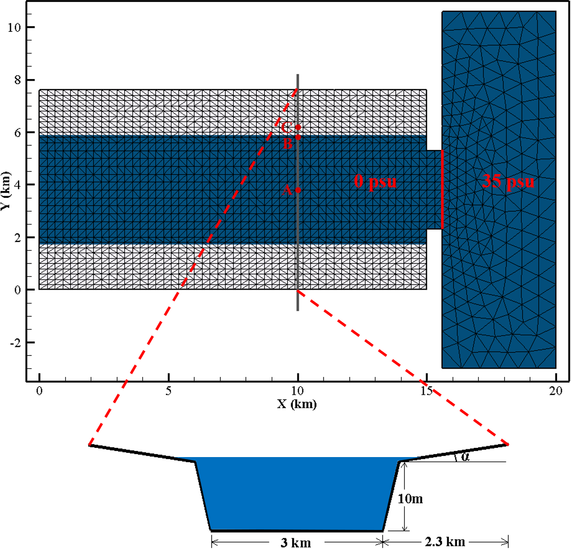 Figure 10The calculation domain and its grid division of the semi-closed estuary. The minimum grid resolution is 200 m. The river channel cross-section is symmetric along the channel centreline and uniform along the channel direction. The initial water depth is 10.2 m and α = 0.0007. Three characteristic points are marked: the channel centre (A), the WD boundary (B), and the initially dry location (C). The initial salinity is set to 0 on the left side of the solid red line and 35 psu on the right side.