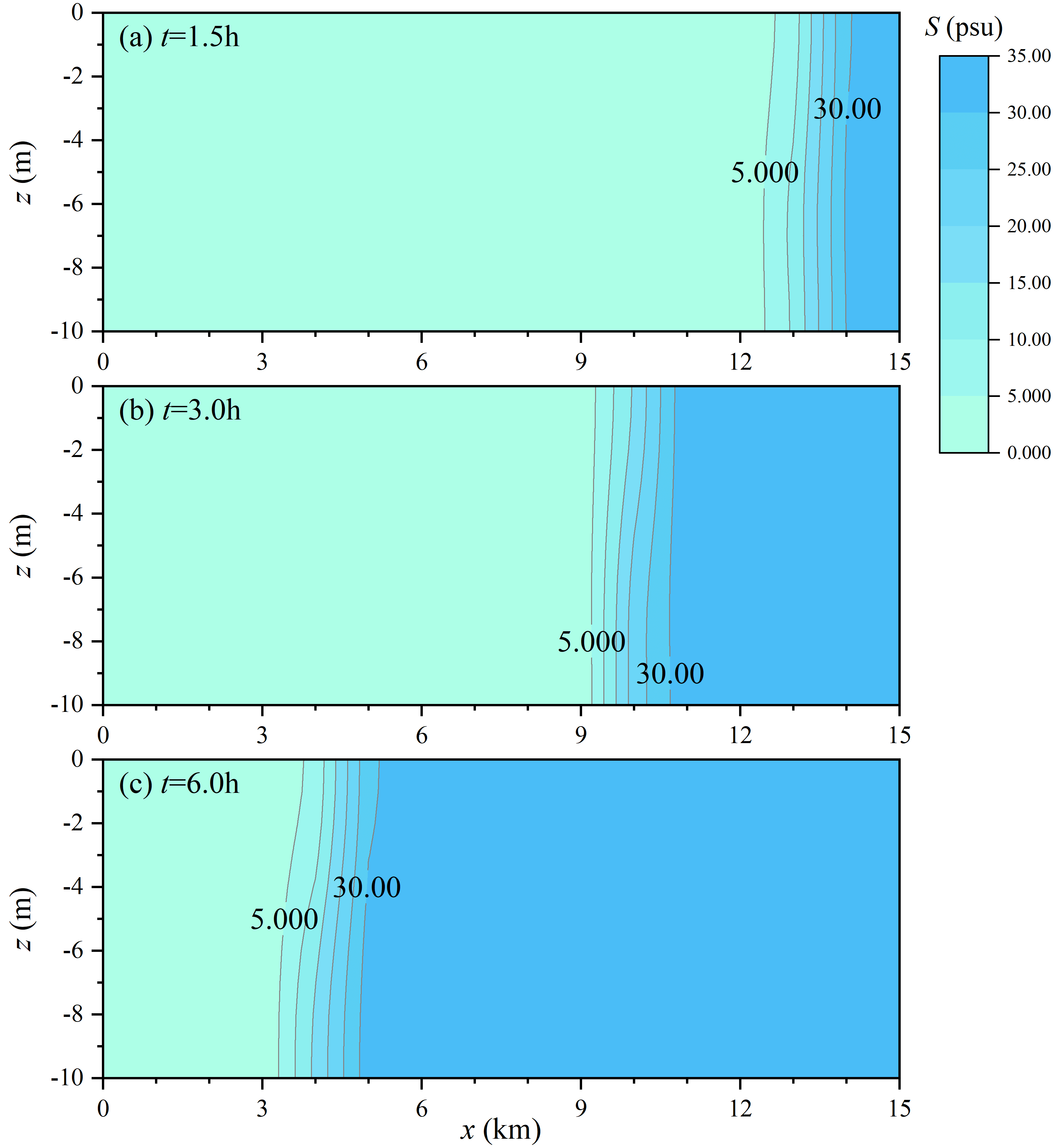 During the flood tide, seawater from the open boundary flows into the semi-closed channel and overtops the floodplain (Fig. 11). Three representative points were selected to analyse temporal variations in tidal water elevation and velocities: site A, located at the centre of the channel; site B, near the WD interface on the top of the riverbank slope at the initial time; and site C, situated in the initially dry intertidal zone (Fig. 10). At sites A and B, the surface water elevations exhibit nearly identical variations over a lunar day. However, at site C, water levels show periodic fluctuations only during the 8 h corresponding to the high-water time, remaining 0 the rest of the time (Fig. 12a). For site A, the mean velocity in the along-channel direction exhibits well-defined periodic variation, while the mean velocity in the cross-channel direction remains close to 0, indicating that the velocity field within the channel is minimally affected by the WD boundary treatment. For site B, the mean velocity in the along-channel direction is generally similar to that of site A. However, during the two flood tide phases, the velocity is slightly reduced due to the influence of the wetting and drying boundary treatment. In contrast, the mean velocity in the cross-channel direction shows periodic variation consistent with the tidal cycle. At site C, velocity is only observed during high water levels, with both the magnitude and the direction of the velocity varying during the 8 h window of tidal inundation (Fig. 12b and c). Moreover, the salinity variations along the channel centreline are shown in Fig. 13. As seawater intrudes from the estuarine mouth, the salinity values within the channel progressively increase in the negative x direction. Vertically, the salinity distribution exhibits a characteristic pattern of lower salinity near the surface and higher salinity near the bottom. Although this numerical experiment may not provide highly quantitative conclusions, the model's simulation results of the saltwater intrusion process involving WD interfaces are consistent with physical expectations.