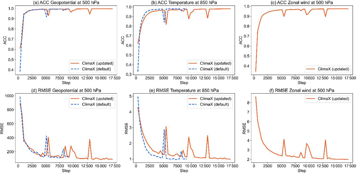 Figure 1Training curves for the default and updated ClimaX models (dashed blue and solid orange lines) verified against WeatherBench data in 2016, as a function of the number of training steps. Each training step includes 64 training data in a mini batch. Panels (a)–(c) and (d)–(f) show anomaly correlation coefficients (ACCs) and root mean square errors (RMSEs). Panels (a) and (d), (b) and (e), and (c) and (f) are geopotential at 500 hPa (m2 s−2), temperature at 850 hPa, and zonal wind at 500 hPa. There are no dashed blue lines in panels (c) and (f) because the default ClimaX model does not predict zonal wind at 500 hPa.