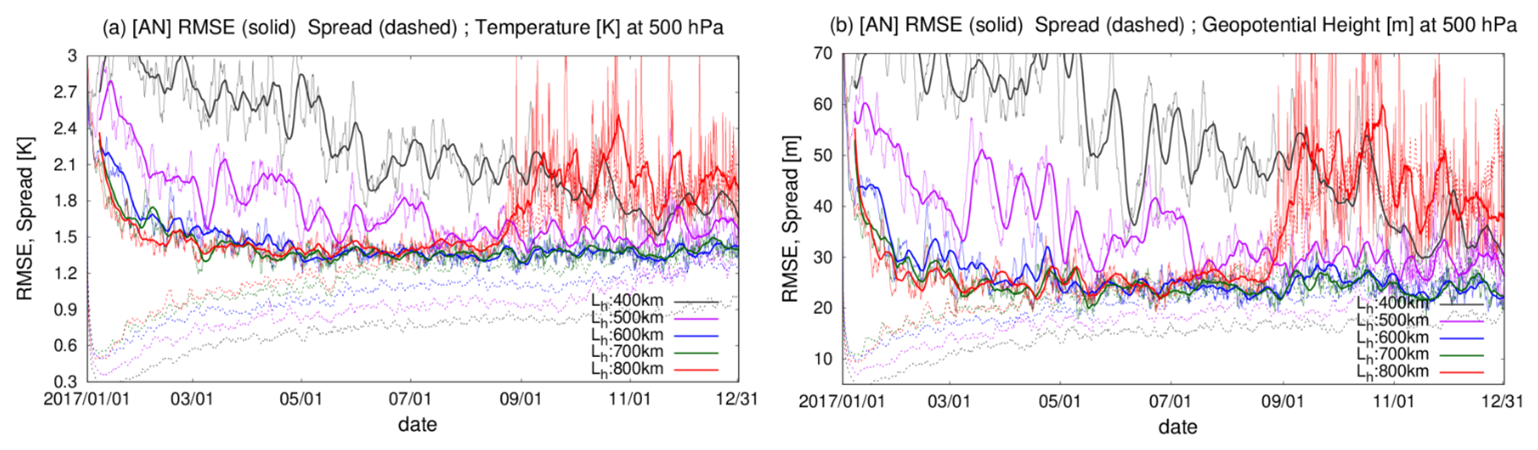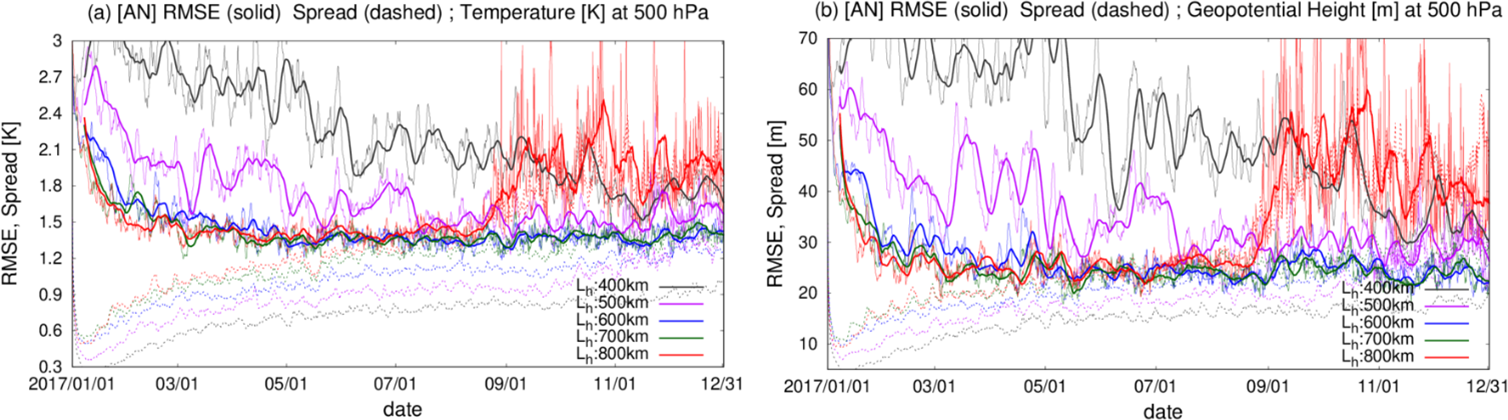 Figure 4 presents the time series of global mean root mean square errors (RMSEs) for temperature and geopotential height at the fifth model level, with four different horizontal localization scales (Lh). After the initiation of data assimilation, all experiments showed reductions in analysis errors. Experiments with Lh= 500, 600, and 700 km showed stable performance over a period of 1 year, until the end of 2017. Notably, data assimilation improved not only the observed variable, temperature, but also the unobserved variables, such as geopotential height. This indicates that observation information was propagated to unobserved variables through the data assimilation cycle. In contrast, the experiment with Lh= 800 km exhibited filter divergence after September 2017 due to erroneous error covariance associated with the larger localization scale. In addition, the experiment with Lh= 400 km kept reducing the RMSEs over a year, but the RMSEs were still higher than those of the other experiments, with the exception of Lh= 800 km. This indicates that a localization scale that is too small is suboptimal. This implies that ensemble-based error covariance is beneficial to some extent for propagating the impacts of assimilated observations for distant grid points.