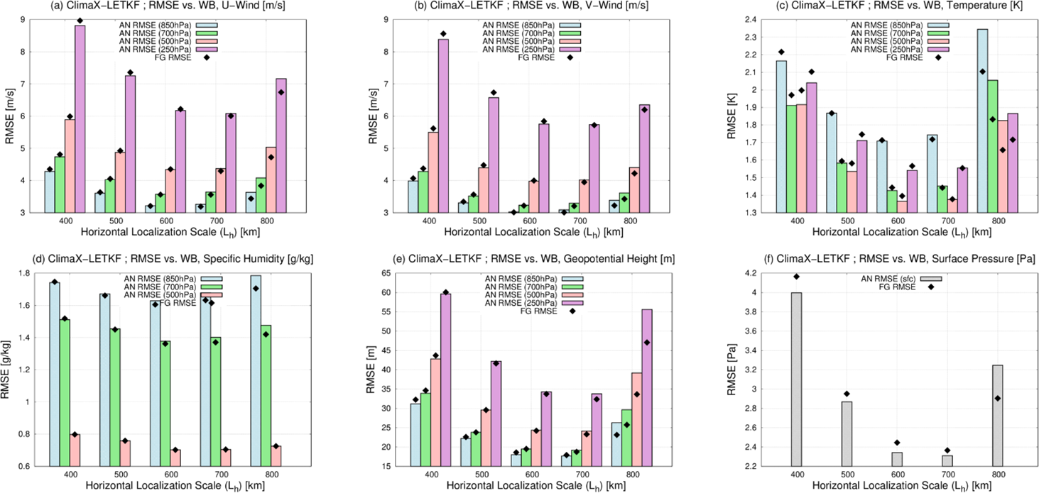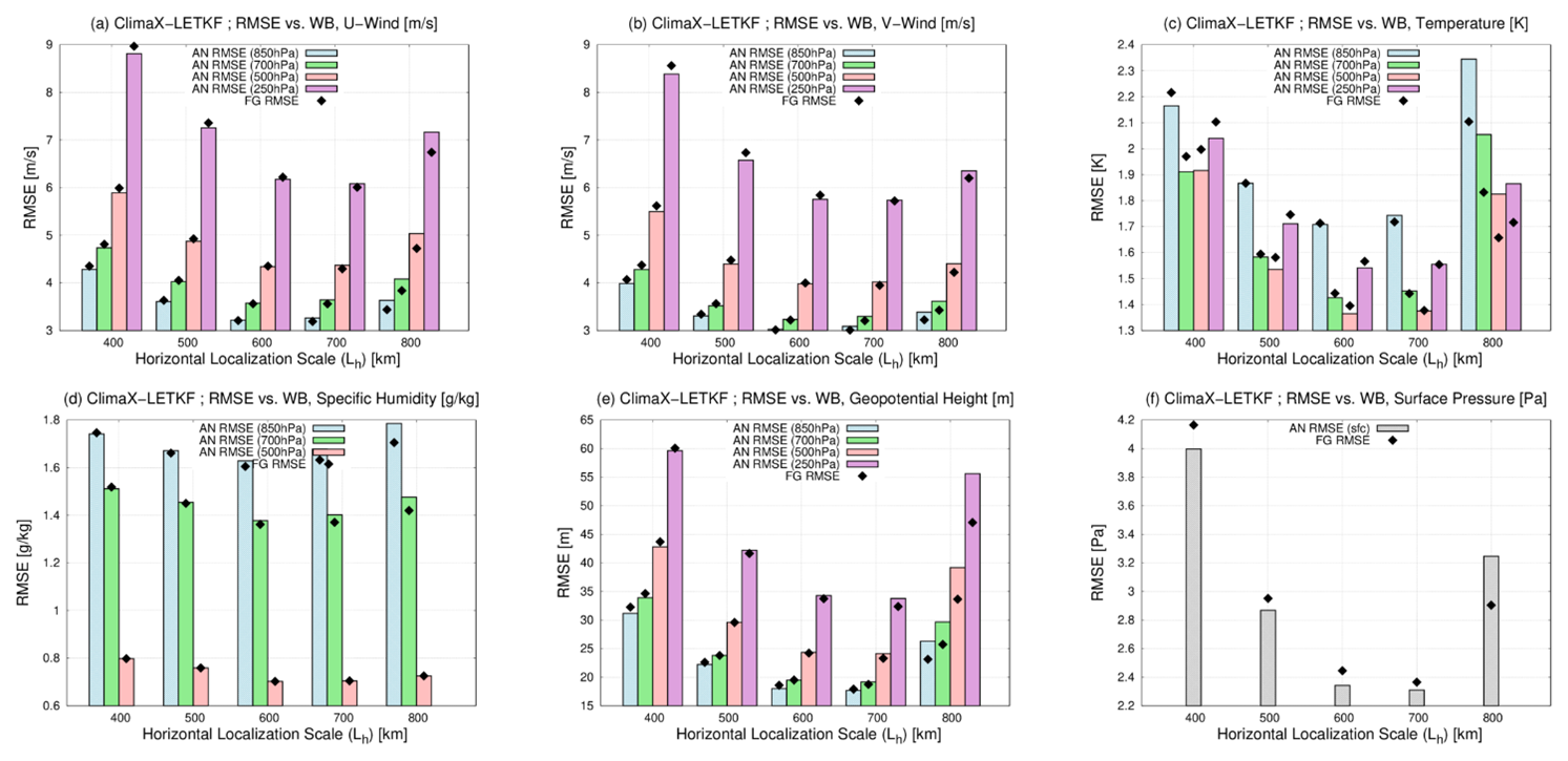 Among the five experiments, a localization scale of Lh= 600 km yielded the lowest analysis RMSEs for most variables. Significant analysis error reductions were observed for temperature and surface pressure. However, no clear impacts were observed for zonal and meridional winds. Even slight degradations were detected, implying that spatial and inter-variable error covariance may not be well represented in our ClimaX–LETKF.