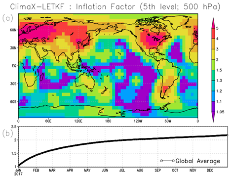 Two major advancements are required for AI-based weather prediction models to improve ensemble data assimilation. First, it is imperative that AI models generate physically consistent forecast variables. The accuracy of spatial and inter-variable error covariance would be improved by this enhancement, which would require AI model training procedures to include physical constraints such as hydrostatic and geostrophic balances, in addition to decreasing the mean square errors of the target variables. Second, it is crucial to accurately capture the error growth rate. Our findings demonstrated that error growth based on ensemble ClimaX predictions was weaker than that of dynamical NWP models, leading to higher inflation factors (Fig. 7). Thus, ensemble forecasts produced by AI weather prediction models likely exhibit insufficient spread. In weather forecasting, capturing forecast uncertainty is as important as providing accurate forecasts. Recent studies have begun to develop models for generating statistically accurate ensembles by using generative models (Price et al., 2025) or by training on probabilistic cost functions (Kochkov et al., 2024). Other possible solutions for improving the error growth are to develop a set of slightly different AI models by randomizing the seed in the AI training process as an analogy to stochastic parameterization (Weyn et al., 2021) or to incorporate the Lyapunov exponent within the cost function of model training (Platt et al., 2023). Note that the present experiments were conducted at a coarse resolution of 5.625°, which may limit the ability of the ClimaX–LETKF system to accurately diagnose localized weather phenomena. At higher spatial resolutions, AI models may capture mesoscale and sub-synoptic features, potentially leading to more realistic ensemble-based error covariances. Future work will explore the data assimilation system's behaviors at higher resolutions using more advanced versions of AI models with denser observation datasets.