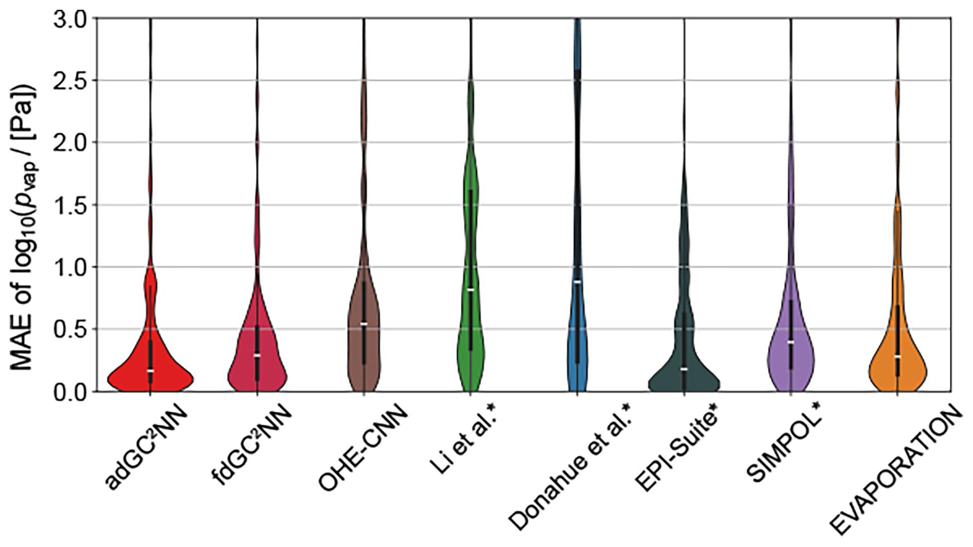 Figure 4Violin plots representing confined test set error distribution of models shown in Fig. 3. Medians are displayed as white markers, interquartile ranges as vertical wide black lines and 1.5× interquartile ranges as vertical narrow black lines. Outliers with an MAE >3 log-units are not shown. Methods marked with an asterisk likely used a fraction of our test data in their training.