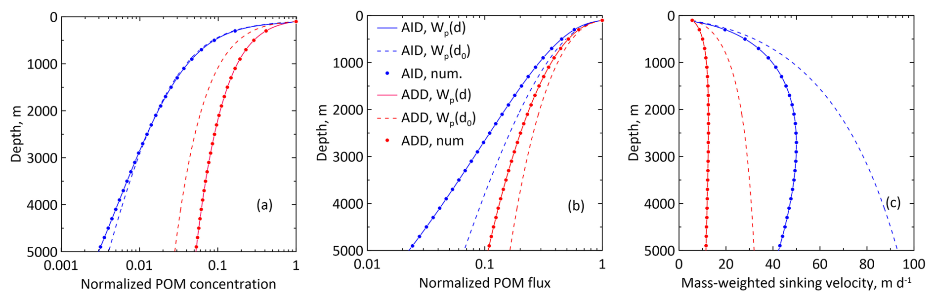 Figure 1Normalized total POM concentration Cp (a), total POM flux Fp (b), and weighted vertical velocities of the particles (c) for the AID (blue lines) and ADD (red lines) models calculated from the analytical and numerical solutions. The dashed lines correspond to the solutions of Eq. (1) at constant Wp(d0), whereas the solid line corresponds to the solution of the problem at variable Wp,d. The small circles correspond to the numerical solutions obtained via the AID and ADD models.